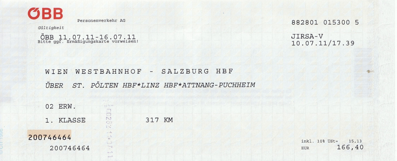 ウィーン→ザルツブルグ 1等を2人分。 83.2ユーロ×2で166。4ユーロ。