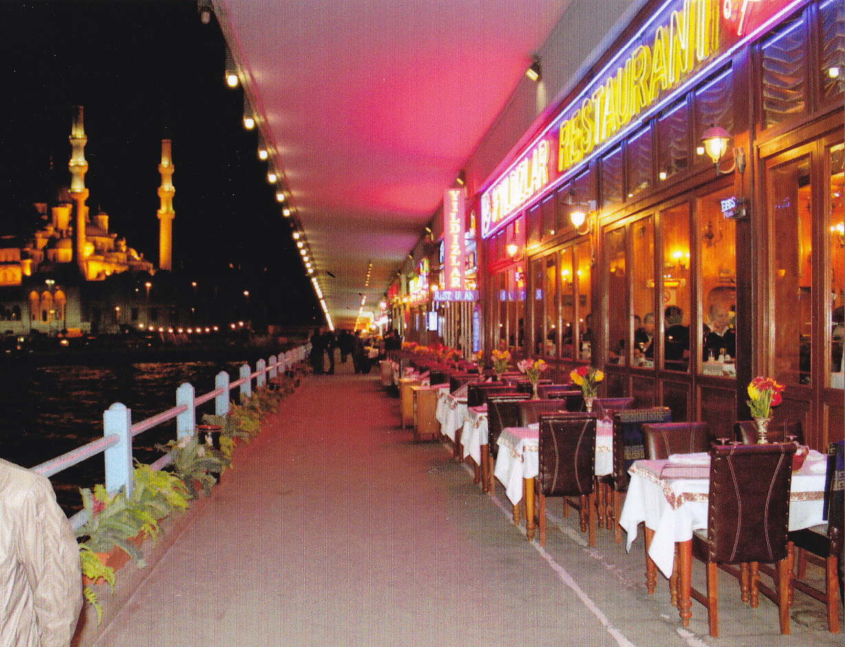 夜は、これまた夜景がすばらしい。青い光の中にいくつものモスクのドーム屋根とミナレット、暗闇の中の海、光……。夜は混んでいないのでゆっくりこの光景を楽しめる。