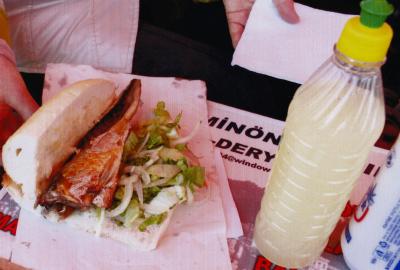 私は魚好き、夫はあんまり…。だから1個買って、夫はちょっぴり、私が大部分食べました。サバの干物半身がレタスなどと一緒にフランスパン半分に挟まれたサンドイッチと言えば分かるでしょう。
