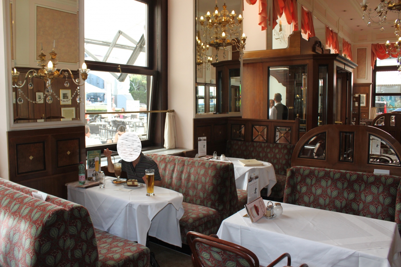 夫は辛党なのでワインとサンドイッチ。私は紅茶と、もちろんザッハートルテ。この2年前にツアーできたとき友人が買ったミニトルテをホテルの部屋で食べて、そのおいしさを知った。ただ、このクリームの量は、私には多すぎで、ほんの少し有ればいい。(なくてもいいかな)昔は甘ければ甘いほどよかったわけで、多分これは大いなる贅沢だったのでしょう。