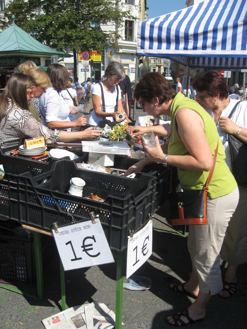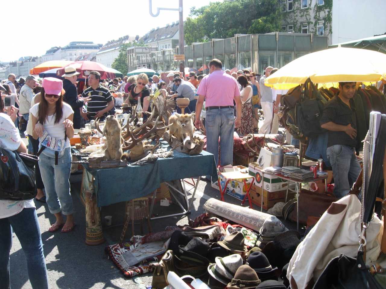 地下鉄のケッテンブリュケンガッセ駅で降りる。駅の前からすぐにテントが広がっている。駅から近いところは衣類、雑貨、花など。だんだんに進んでいくと野菜、肉、魚、パン、乾物、香辛料、ドライフルーツ、そして和食や中華の材料店まで、何でもある。このような店が3列で200?くらい続いている。アメ横や築地場外のにぎわいがを想像すると良い。