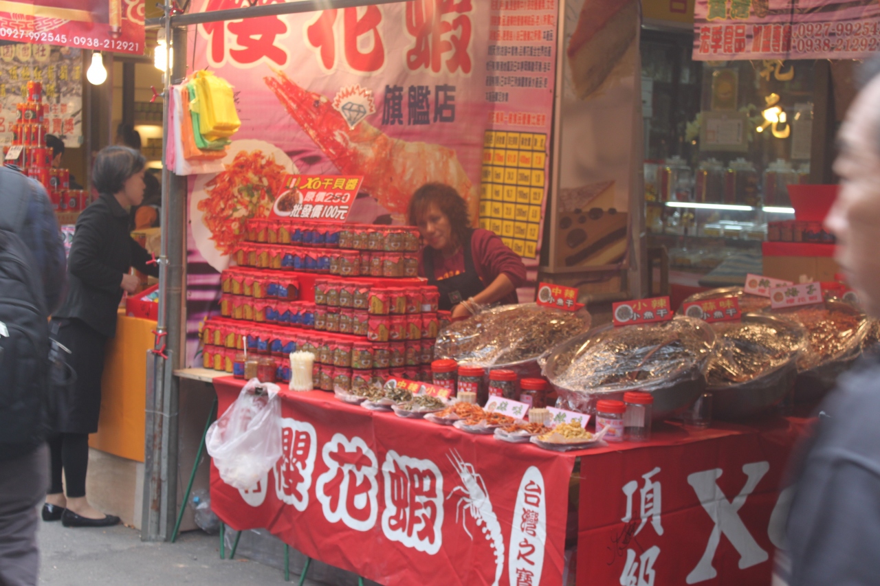 地下鉄で中心部から行く場合、淡水線で淡水行きに乗り士林の一つ手前の駅で降りるのがよい。にぎわいはアメ横を思うと良いかも知れない。お祭りの縁日がずっと続いていると言おうか。私たちは何か買うと言うより、この「お祭り騒ぎ」を見るために出かけていった。B級グルメ満載の市場や屋台は人々のエネルギーに満ちている。観光客も地元民も、老若男女値段交渉したり、食べ歩いたり、並んだり。台湾の楽しい夜散歩が出来た。