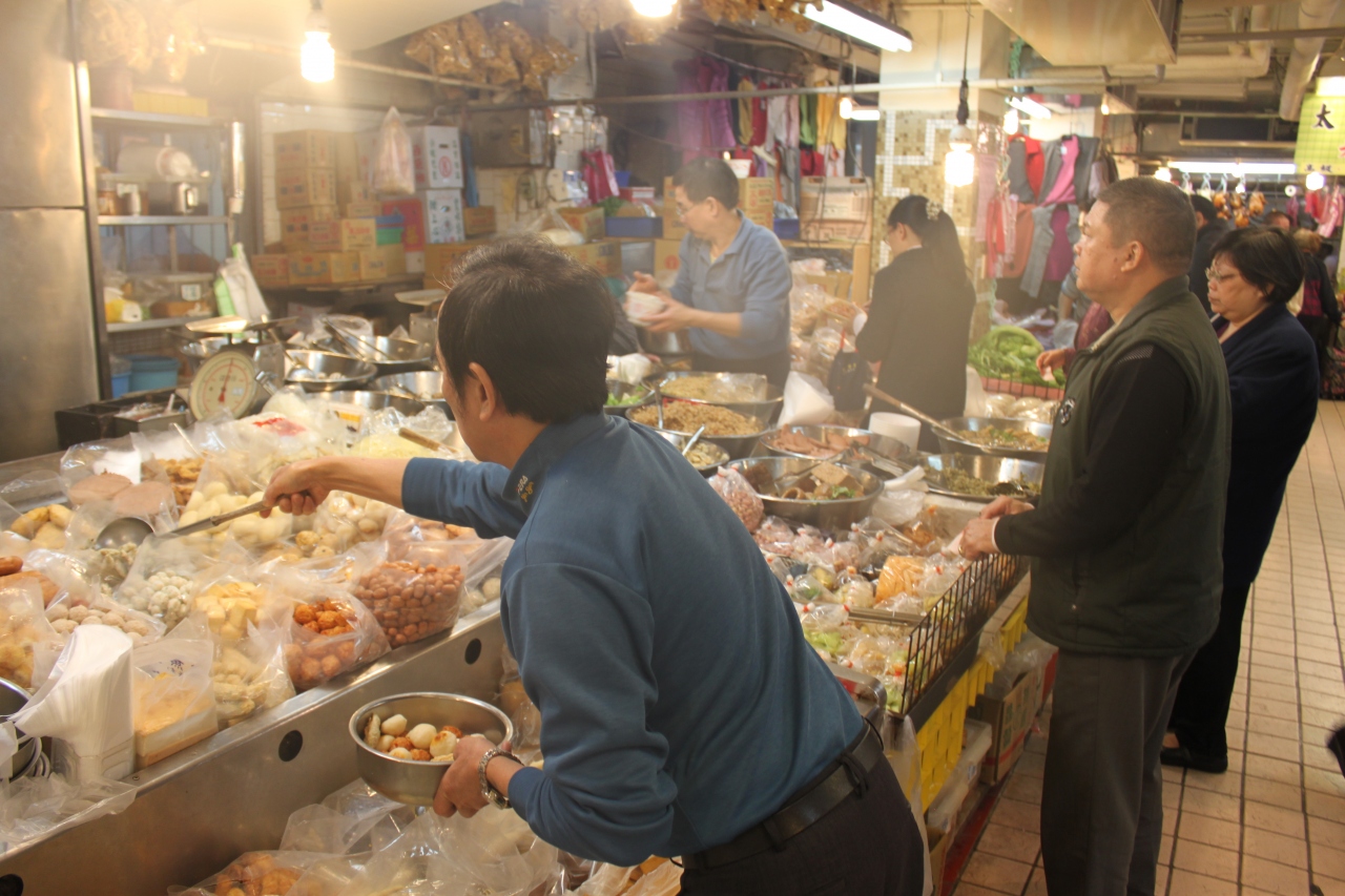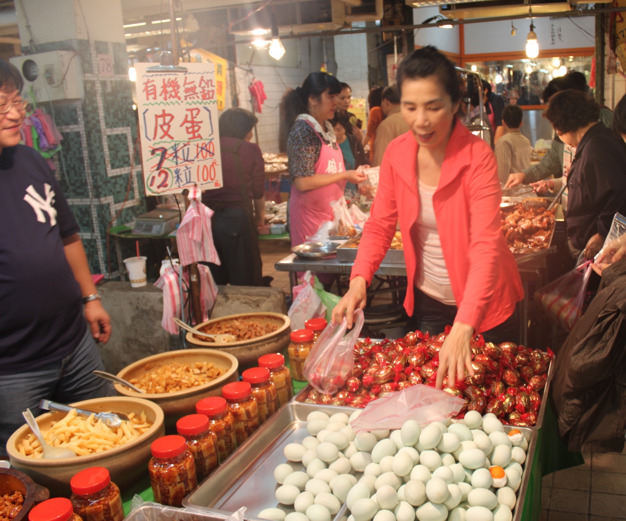 行天宮に行った帰りに、占い横丁を通って地下道から出てきたら、この市場が目に付いた。市場好きなので早速は入ってみた。観光客相手ではなく、市民のための市場。食べ物、特に出来合いの総菜が多い。台湾は朝市、夜市が発達しているがそれは外食文化が盛んだと言うことなのだろう。家でつくるのが日本より少ないようだ。日本語の上手な人が話しかけてくれて、私たちが見ていた物を色々説明してくれた。あまりに自然だったので最初は店の人かと思ったがそうではなかった。店の人もだったが、親切で有難かった。市場の印象も一層良くなった。