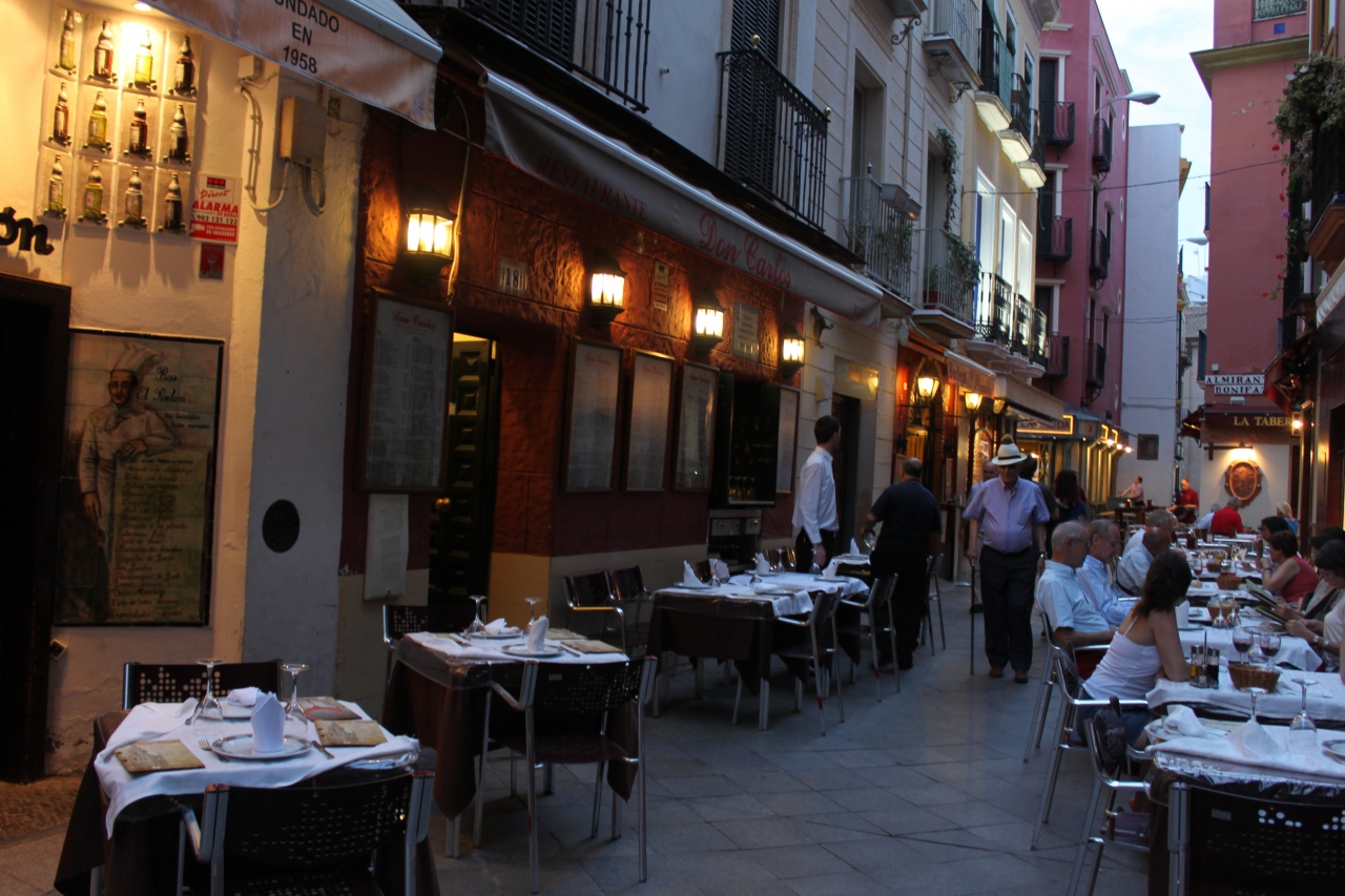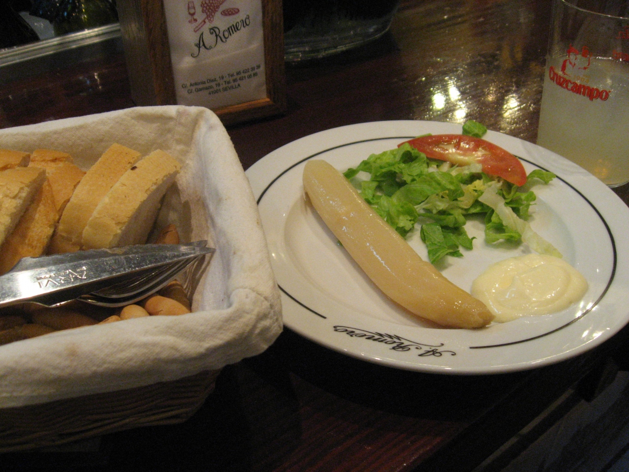 タブラオ「エル・アレナル」に行く前に「まずは、腹ごしらえ」と寄った店。なのでタブラオのすぐそば。闘牛場も近い。スペインでは夕食時間が遅いので8時ころ行くとまだ誰も客がいなかったりと言うことがあるが、8時10分頃、ここではもう楽しそうに飲む地元客?の姿があった。店の前も明るい感じだし、軽くいっぱい、にはちょうど良い店。ホワイトアスパラがとても美味しかった。