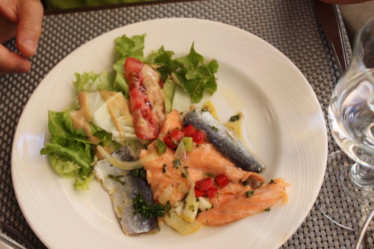 夫は生のシーフードミックス(カキ、エビ、ムール貝、ツブ貝、アサリ)の盛り合わせ。これは大きな器に氷をどっさり入れて見た目も豪華。量もたっぷり。私はイカとサーモンのマリネとブイヤーベース。マルセイユで是非食べようと思っていたので満足。濃厚で良い味。夫もワインも進んで良い店だと上機嫌だった。しめて46.7ユーロ。