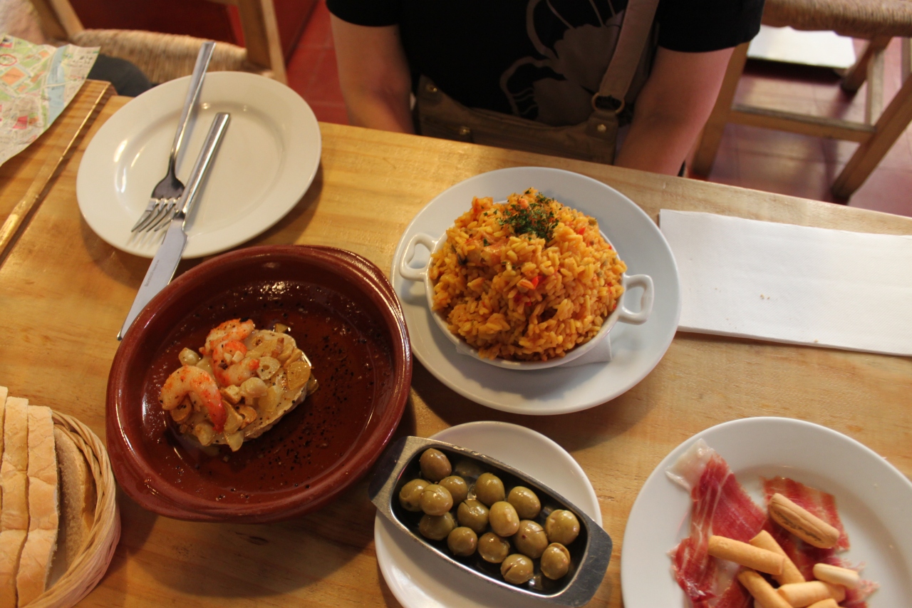 メニューは普通サイズとタパサイズがあって、タパサイズは少量という意味。色々食べたいのでタパサイズを注文。生ハム、パエリア、海老とチーズのオリーブ焼き、ガスパチョ、白ワイン3杯を注文して、計26.5ユーロ。