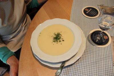 私はアスパラのスープ、夫はソーセージの盛り合わせを注文。料金はソーセージの盛り合わせが13.9ユーロ、スープは5.8ユーロ。ビール、ワイン、ミネラルウォーターを加えて計32.2ユーロ+チップ3ユーロ。味も良く、店の雰囲気もインテリアも好もしかったので満足した。- 旅行時期