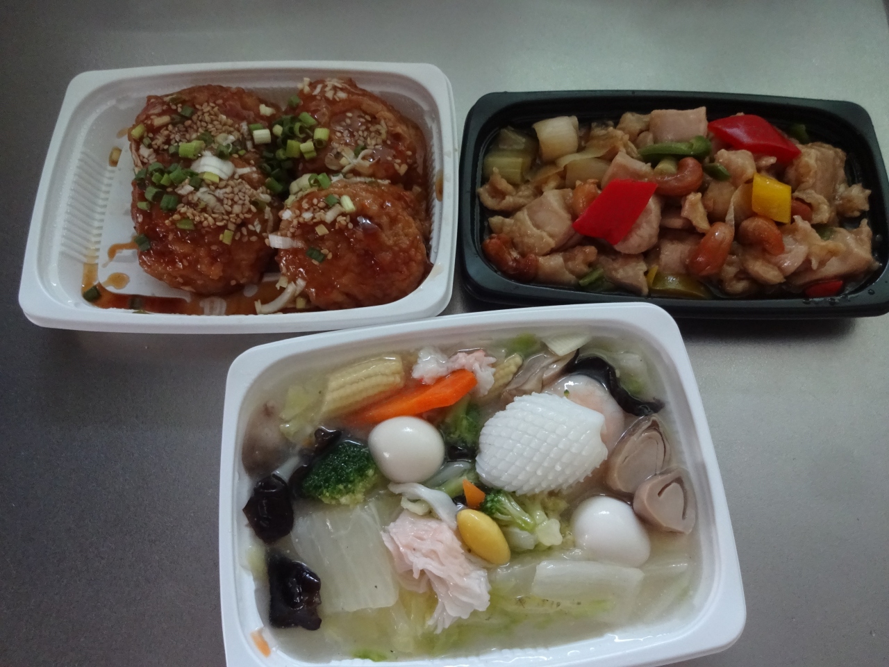 レンコン入り肉団子、鶏とカシューナッツ炒め、八宝菜の3種。八宝菜は塩味であまり濃い味でなく、優しい味。