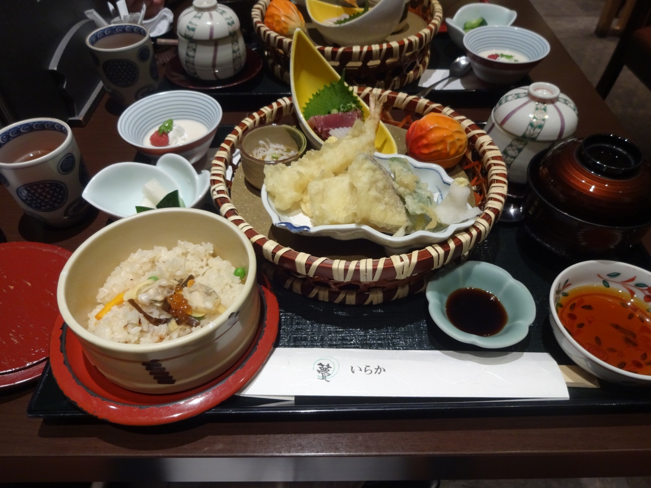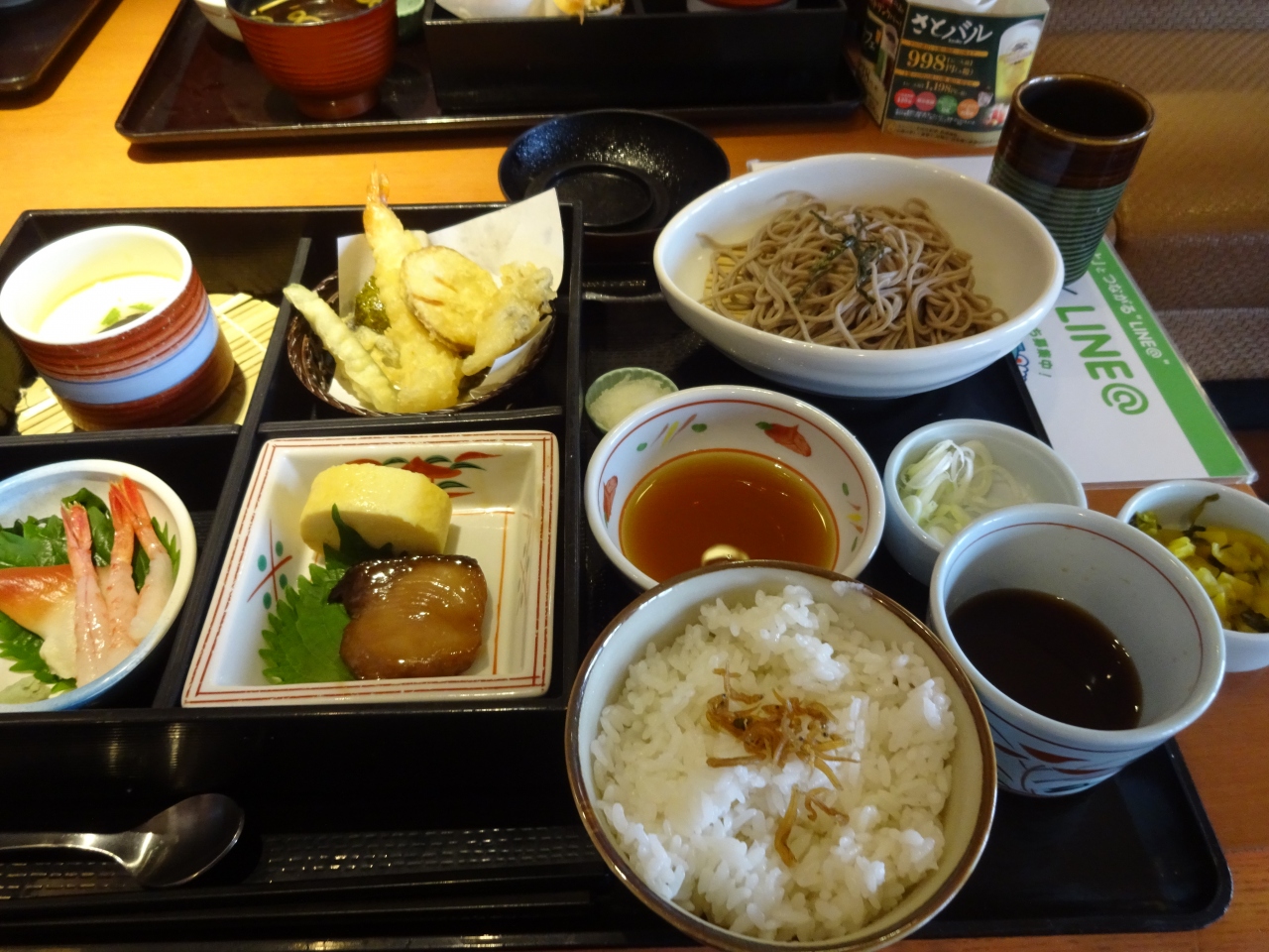 天ぷらと小さな小鉢に卵焼き、ぶりの照り焼き、甘エビお刺身、茶碗蒸し、味噌汁の代わりにはおそばも選べるとのことで私はそれを。