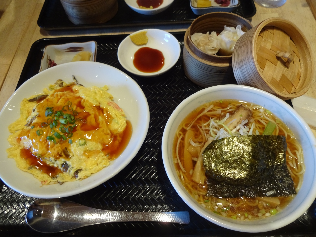 それは、かに玉丼とランメーんのセットにシュウマイが二つとお漬け物付き。