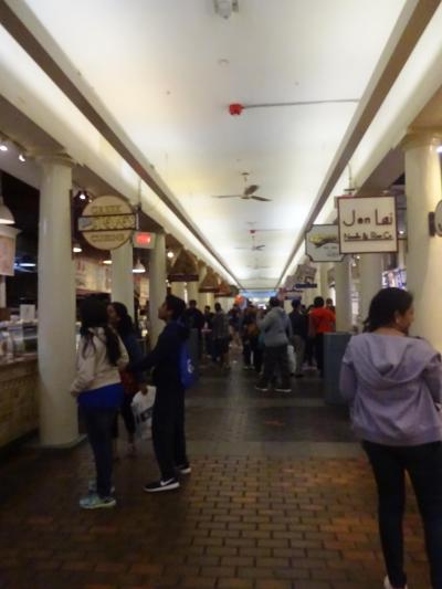細長く続いている中にどんどん歩いて行くとおいしそうな食べものが並び中程にはフードコートになっていて、買ったものが食べられるようになっていた。