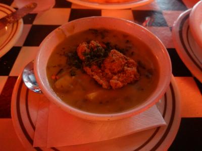 注文したのは名物のガンボとクラブケーキとオイスターシチューを二人でシェア-。