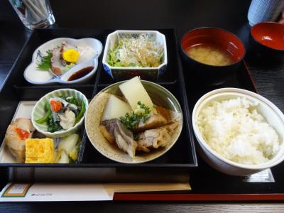 今日の内容はサラダ、ブリ大根、刺身、玉子焼き、焼き魚、小鉢、漬け物、ご飯、シジミの味噌汁で食後にコーヒーだった。