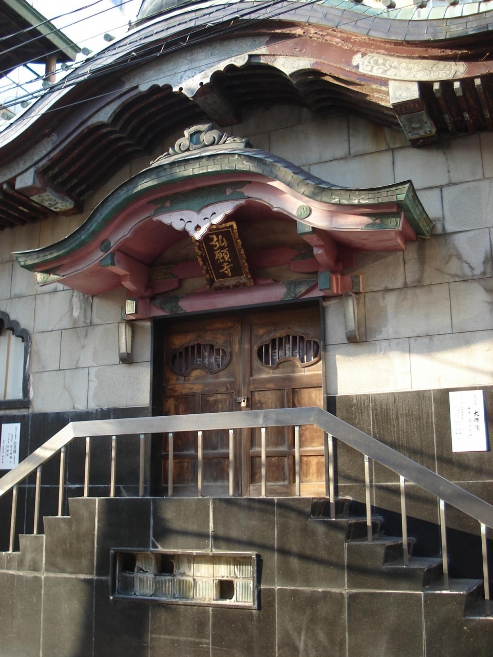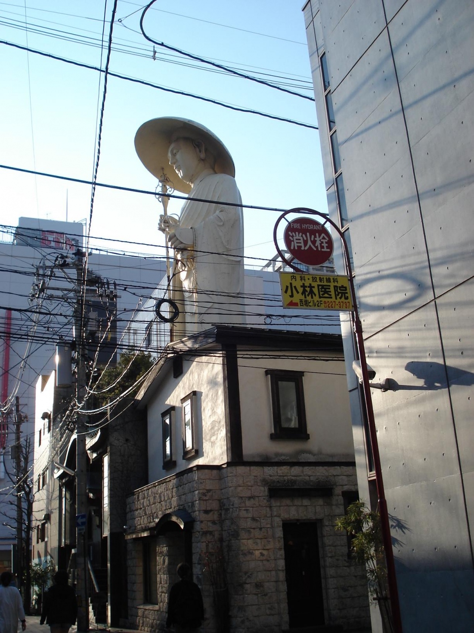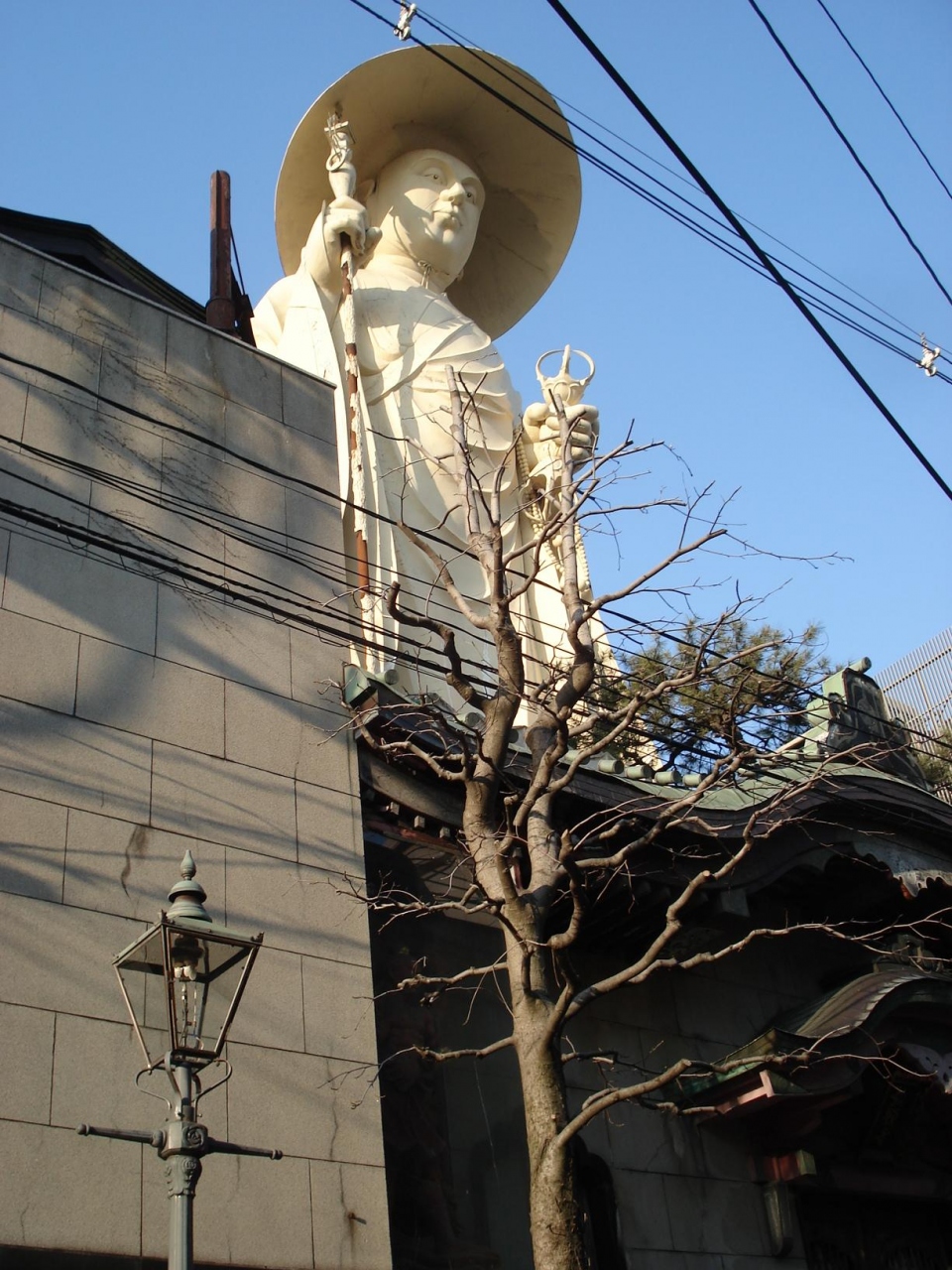 目立つのは寺の屋上に建つ弘法大師像。この場所には不釣り合いの大きさだし、白い大師が突然そびえ立っている光景にはびっくりさせられます。