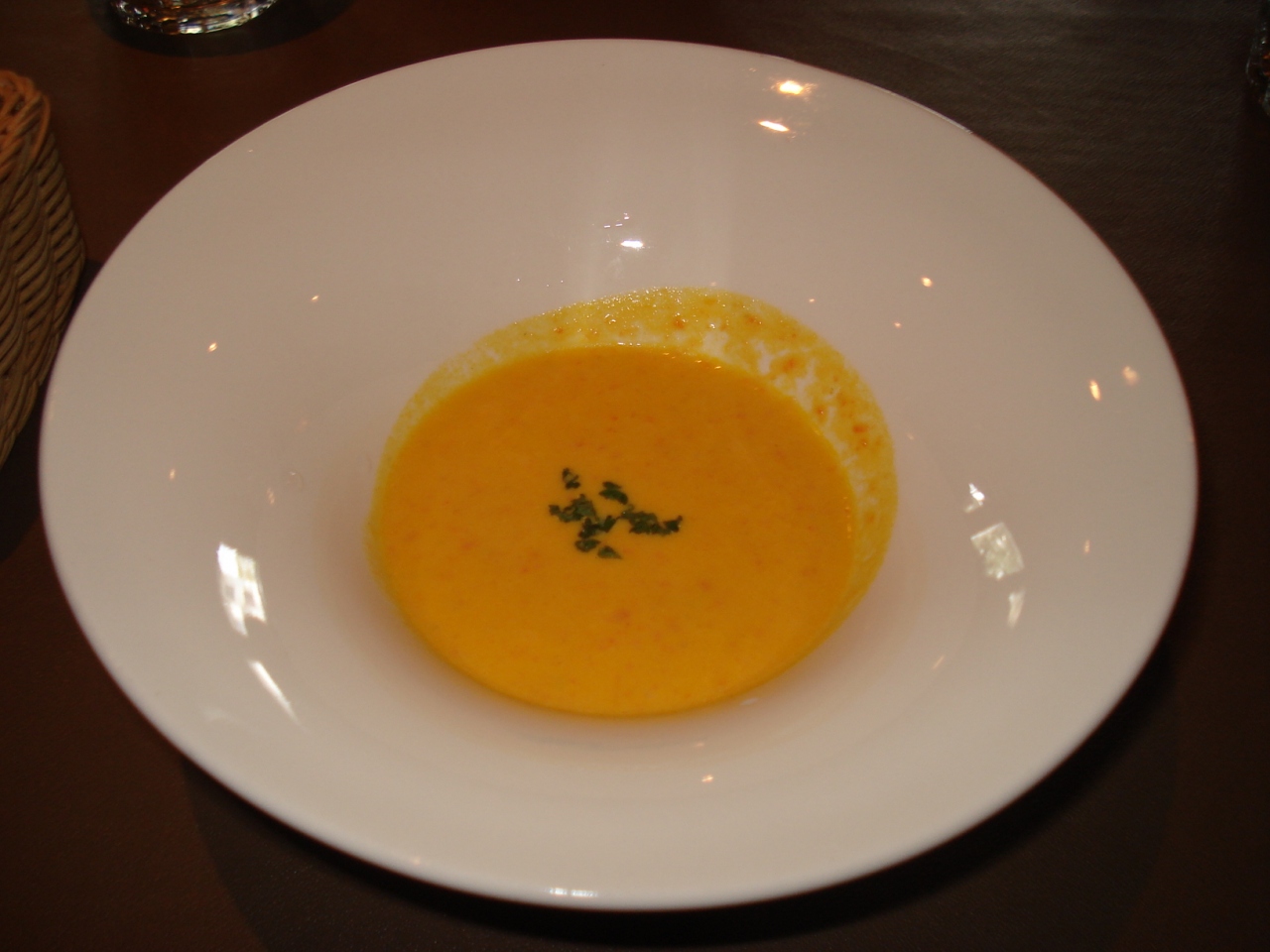 スープはにんじんのポタージュ。甘みが感じられ、おいしいスープ。器もおしゃれ。