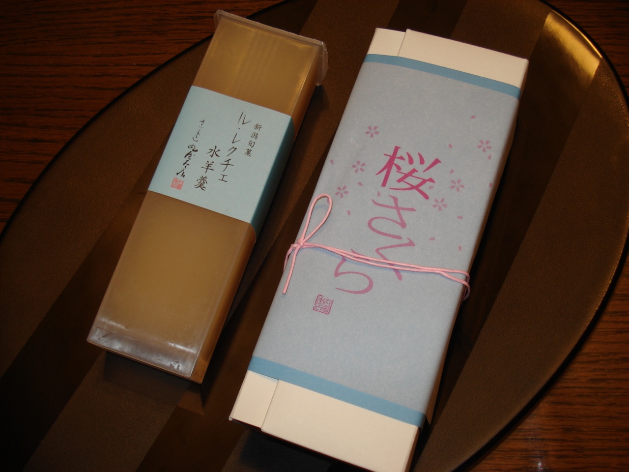 「桜さくら」という見た目も美しいお菓子や洋なしの水ようかん、いろいろな味の一口ようかんは自宅へのお土産用。