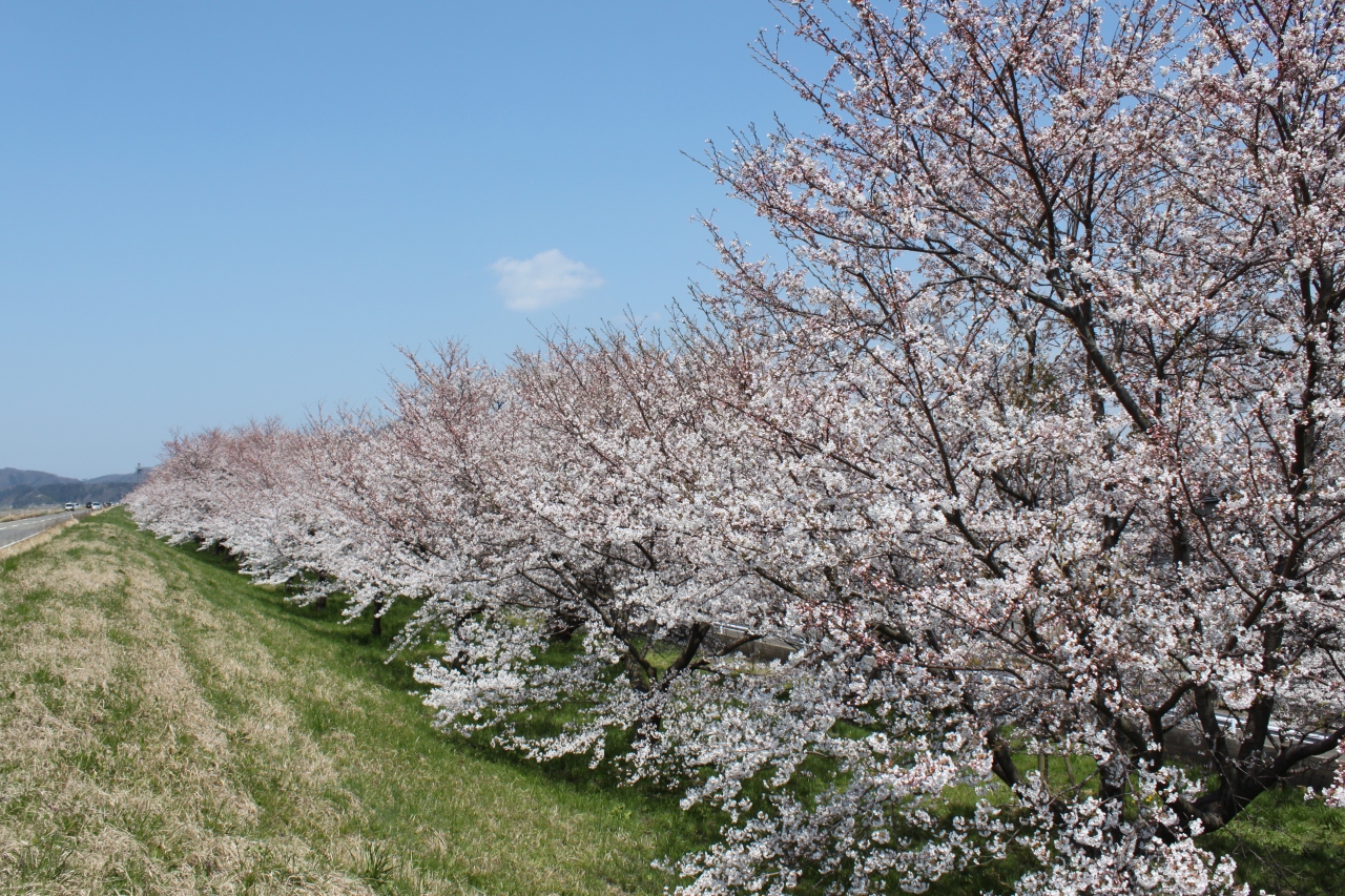 土手には3000本といわれる桜がほぼ満開で、ところどころには商店などの屋号が入った提灯が吊されていました。