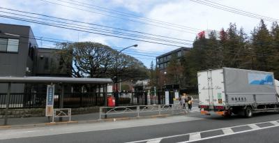 JRの日野駅から歩くと正門まで15~20分くらい。駅から見ると高台になっているので、少しずつ上り坂を上がる感じになる。