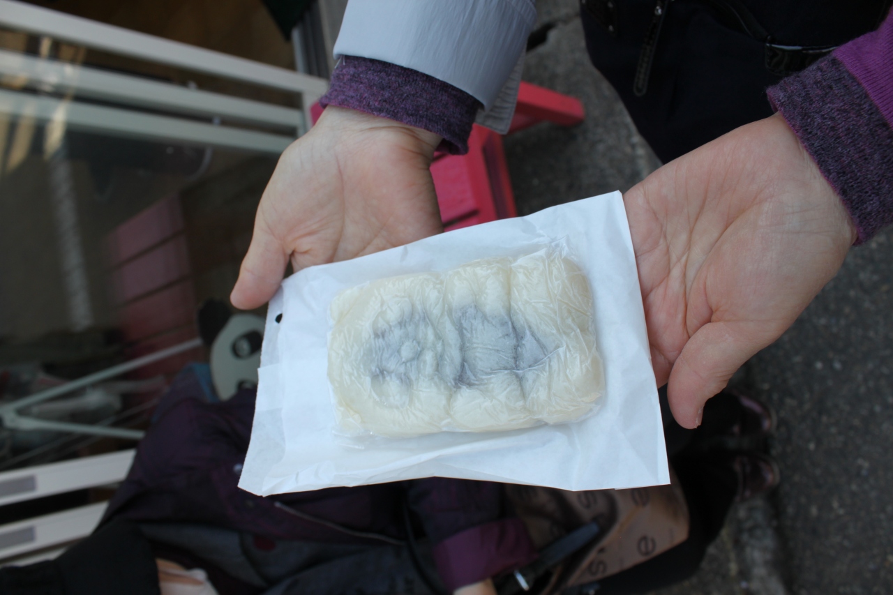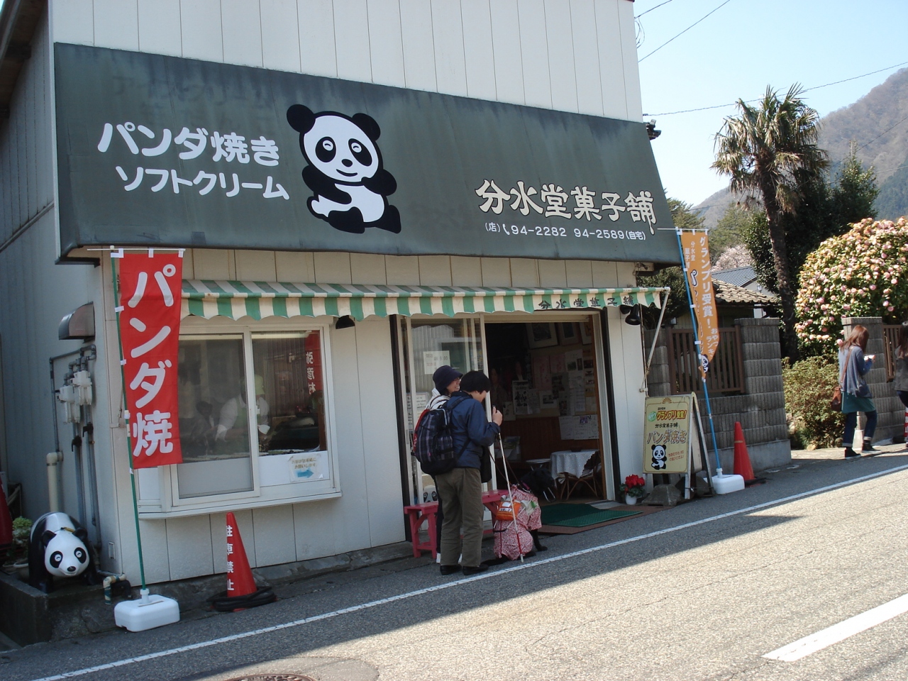 この店の人気商品、パンダ焼きは鯛焼きのようにパンダの型で焼いたもので色は白。黒い部分がないからちょっと?かな。中は三種類だったと思いますが、私は普通の小豆あんを食べました。生地はちょっともちもちして、九州の太宰府で売られている「梅ヶ枝餅」のような感じで、おいしかったです。