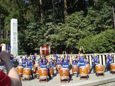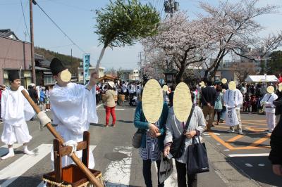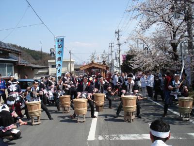 当日は好天の上、桜も見頃となり、昼過ぎに外苑坂通りに行くと、白い装束の人々を先頭に行列がやってきた。止まって桶を叩いての踊りや、綱を引いたのお祭りは、若者が中心で地方色を感じさせ、とても良いものでした。