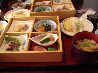 ご飯はホタテとアスパラの炊き込み。お味噌汁は野菜たっぷりの具だくさん。鯛の刺身、天ぷら、カレイの南蛮漬け、煮物炊き合わせ、漬け物……と和食の楽しさ、おいしさを感じさせるメニューで満足しました。