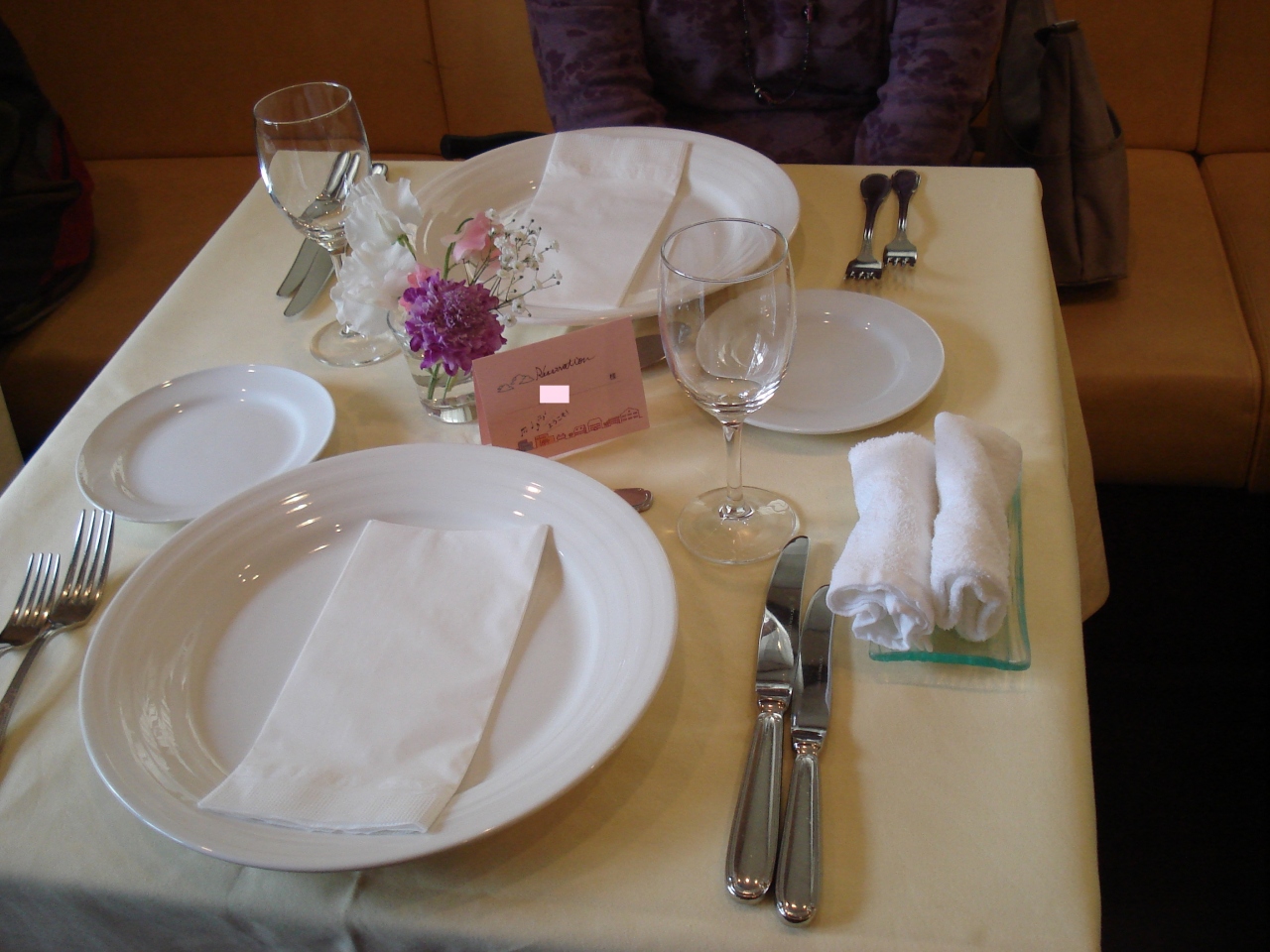 テーブルにはかわいい花。席には予約していたので名前のカード、コートを預かってくれるタイミングなども高級レストラン風。