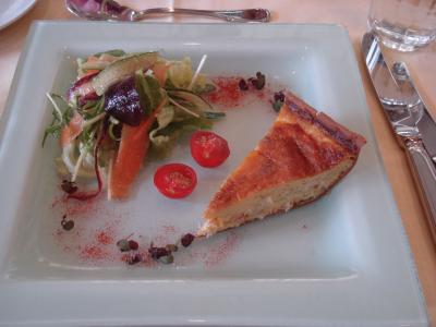 前菜はカニのキッシュとサラダの盛り合わせをチョイス。たっぷりカニが入って優しい味のふわふわキッシュと新鮮野菜は彩りもきれいでとてもおいしかった。