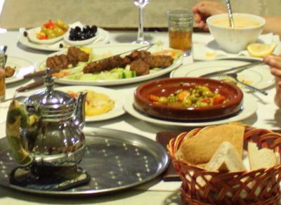 注文したのは野菜スープ、シシカバブ、マラケシュ風ハンバーグ、野菜のタジン、ミントティと水。パンとオリーブは突き出し?かな。