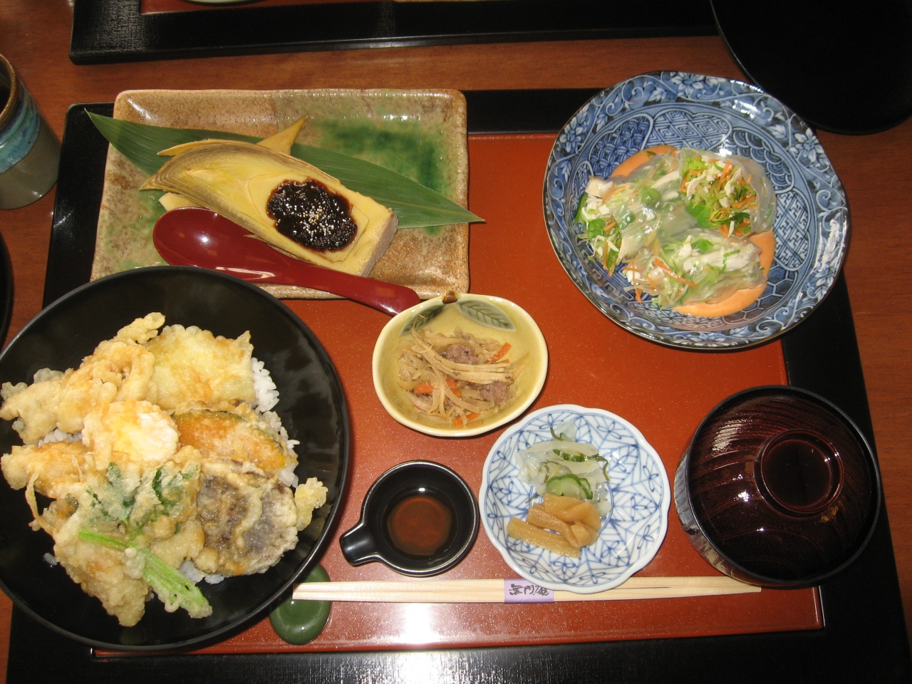 こちらのランチは週替わり(土日はない)で今日はメインは親子天丼でした。親は鶏肉、子は玉子の黄身を天ぷらにして、その他の野菜も加わって天丼になっていました。他に野菜の生春巻き、切り干しの煮物、タケノコの田楽味噌、漬け物、デザートにお汁粉付き、これで1、050円はうれしいお値段。