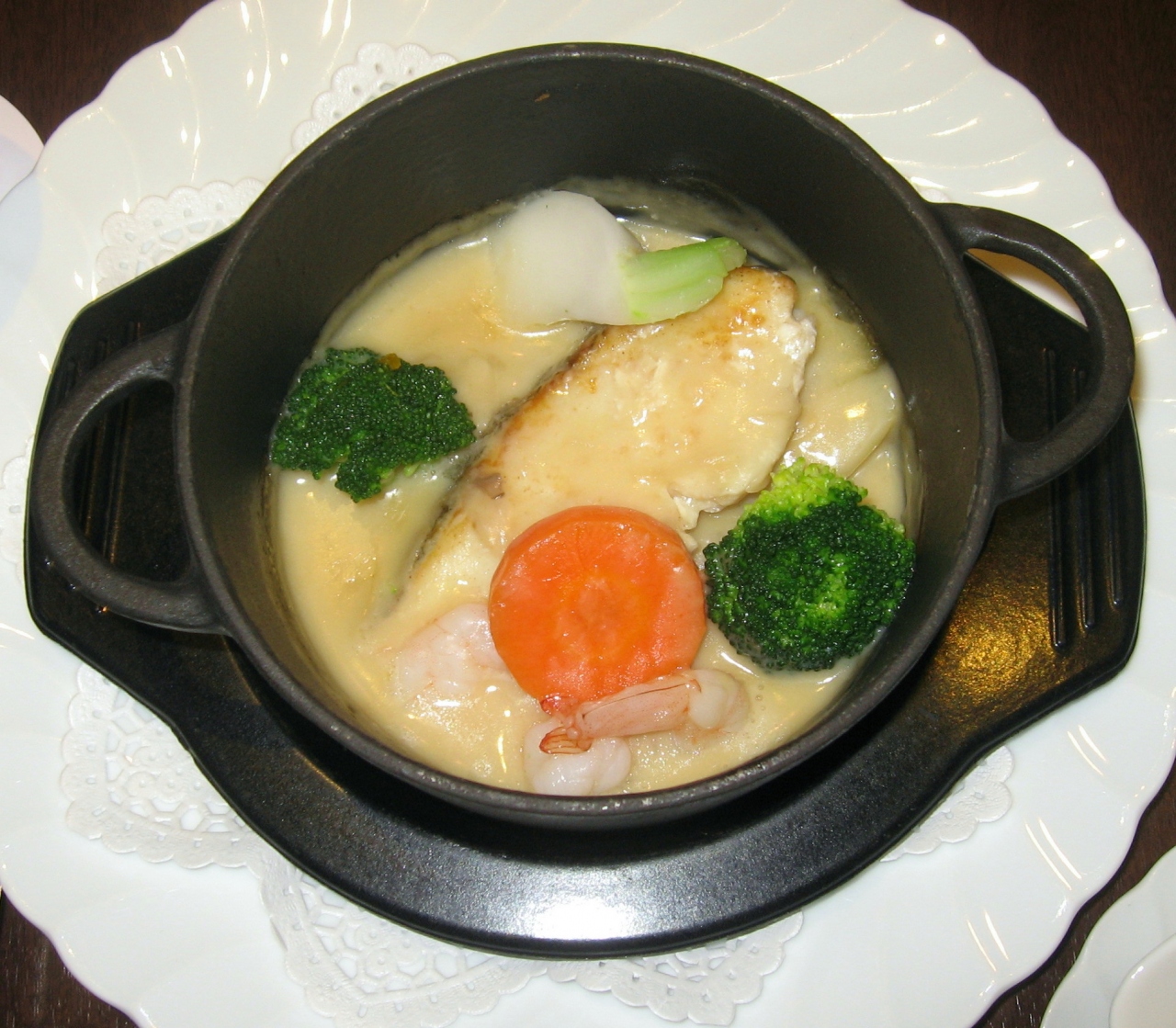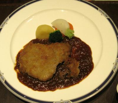 このコースは最初に野菜たっぷりのサラダが白い楕円のお皿で出され、次は豆と野菜のコンソメスープ。すてきなお皿と優しいコンソメ味に満足。魚コースのメインは白身魚と野菜のクリーム煮が小さなダッチオーブンで饗されました。友人の肉コースはビーフカツでウィーンの名物、シュニッツェルのような感じでした。