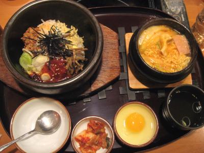 注文したのは1つはランチセット(石焼きビビンバとミニサイズのチゲ、スープ、キムチ少々)それにビールと海鮮チヂミのハーフサイズ。お正月の飲み過ぎ食べ過ぎの後遺症もあり、少な目に。