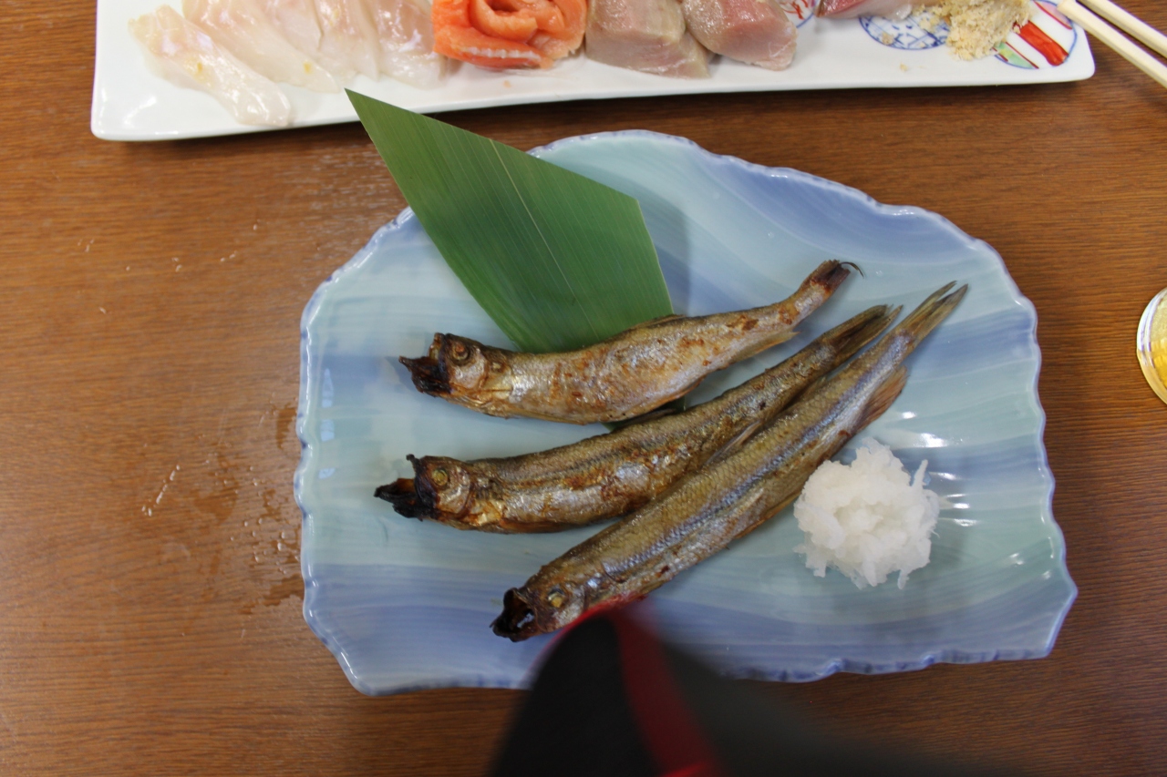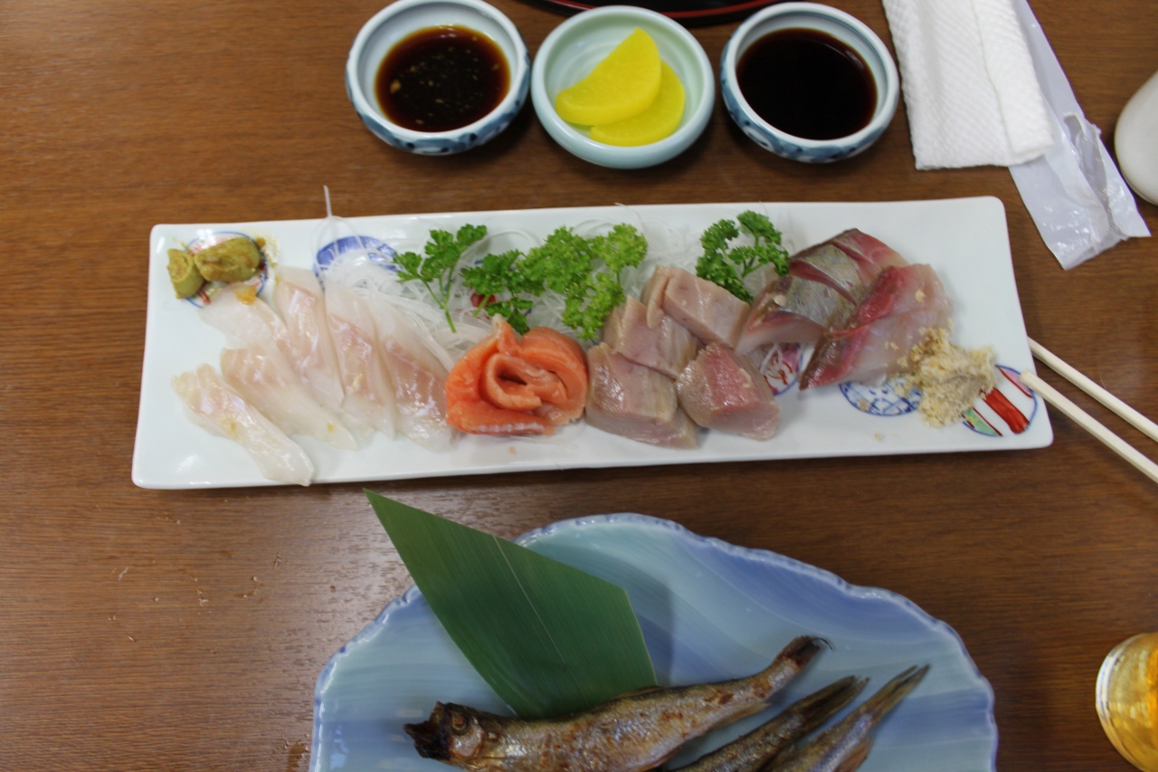 私はこれに御飯とおつゆで刺身定食風。夫はししゃもなどをつまみにビールでいい気分。- 旅行時期