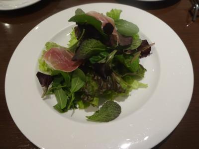 生ハム入りのサラダ、パン、メイン(4種から選べる)デザート、飲み物付き。