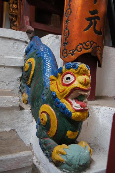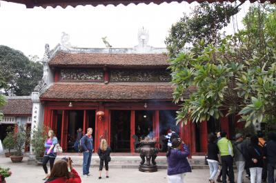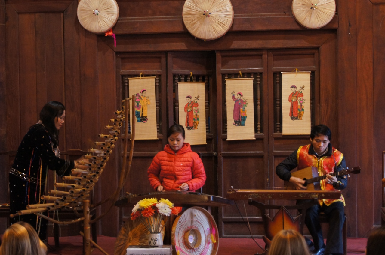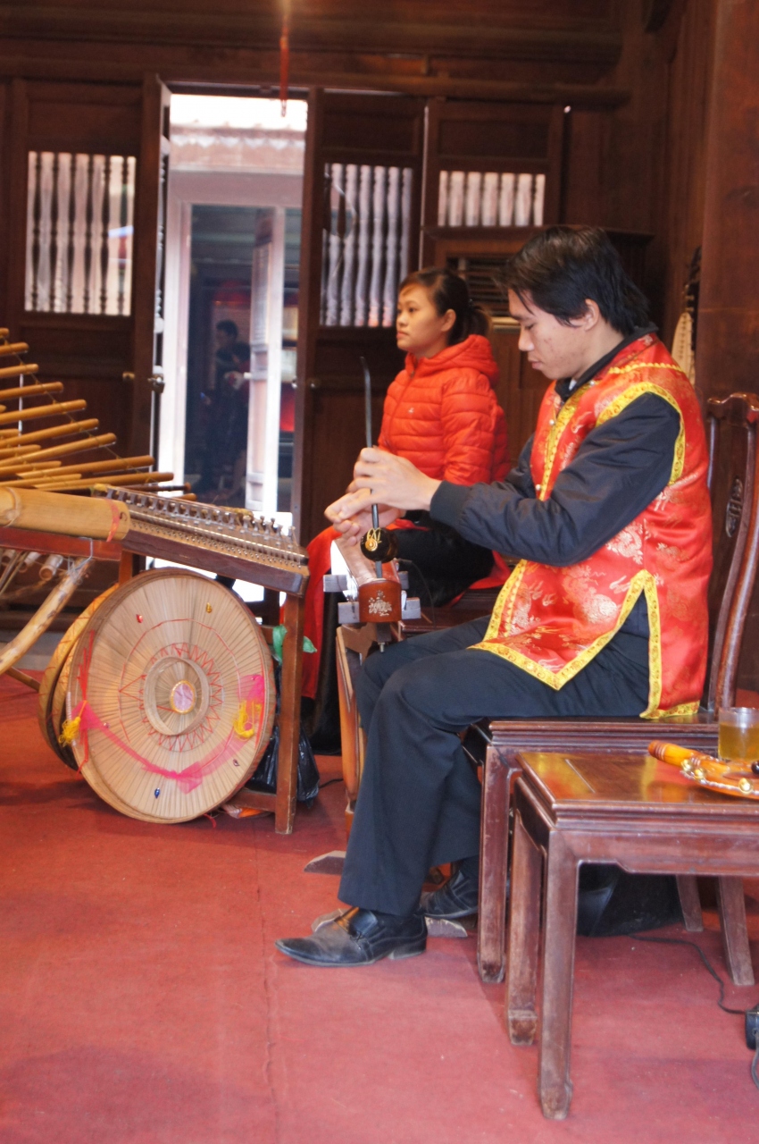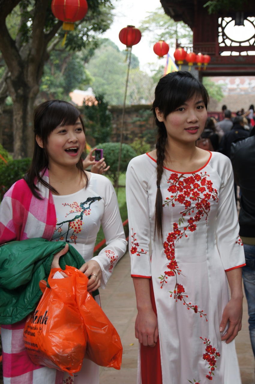 奥の建物の中で、民族楽器の演奏が行われていました。いい音色で、これを聴くだけでもここに来た価値がありました。さらに、今日は日曜日だったからでしょうか。学生たちがアオザイ姿で来ていました。もちろん寒いので、ここに来てから上に着た服を脱いでいます。ツアーのガイドさんが、声を掛けてくれて、一緒に撮影してもらえました。旅行中でアオザイの女性を見かけたのは、こことホアンキエム湖側の玉山祠だけでした。アオザイの姿を見るためにもここがお勧めかな。ただ、日曜でないとだめかも?それとも時期?- 旅行時期