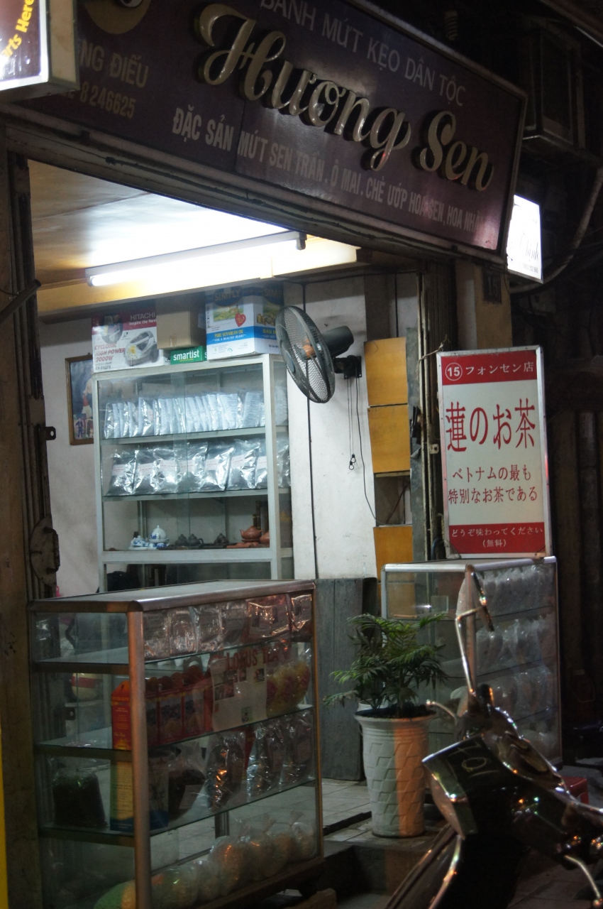 旅行誌に載っていて、ホテル(クアックホア)の近くなので行ってみました。店の作りはかなりしょぼいのですが、価格は現地の人には買えないでしょう。ハス茶50g10ドル。100g19ドルです。現地の人で買う人がいるのでしょうか?買うのは日本人だけ?といいつつも、50gを二袋買ってみました。馬鹿な観光客。レストランでティーバッグのを飲みましたが、香りは全然違います。おっちゃんは10杯ぐらい入れられるといいましたが、さすがに10杯だと色も出ません。5杯ですね。話の種として買うのは良いでしょう。高いと思って飲むとよりおいしいです。(笑)