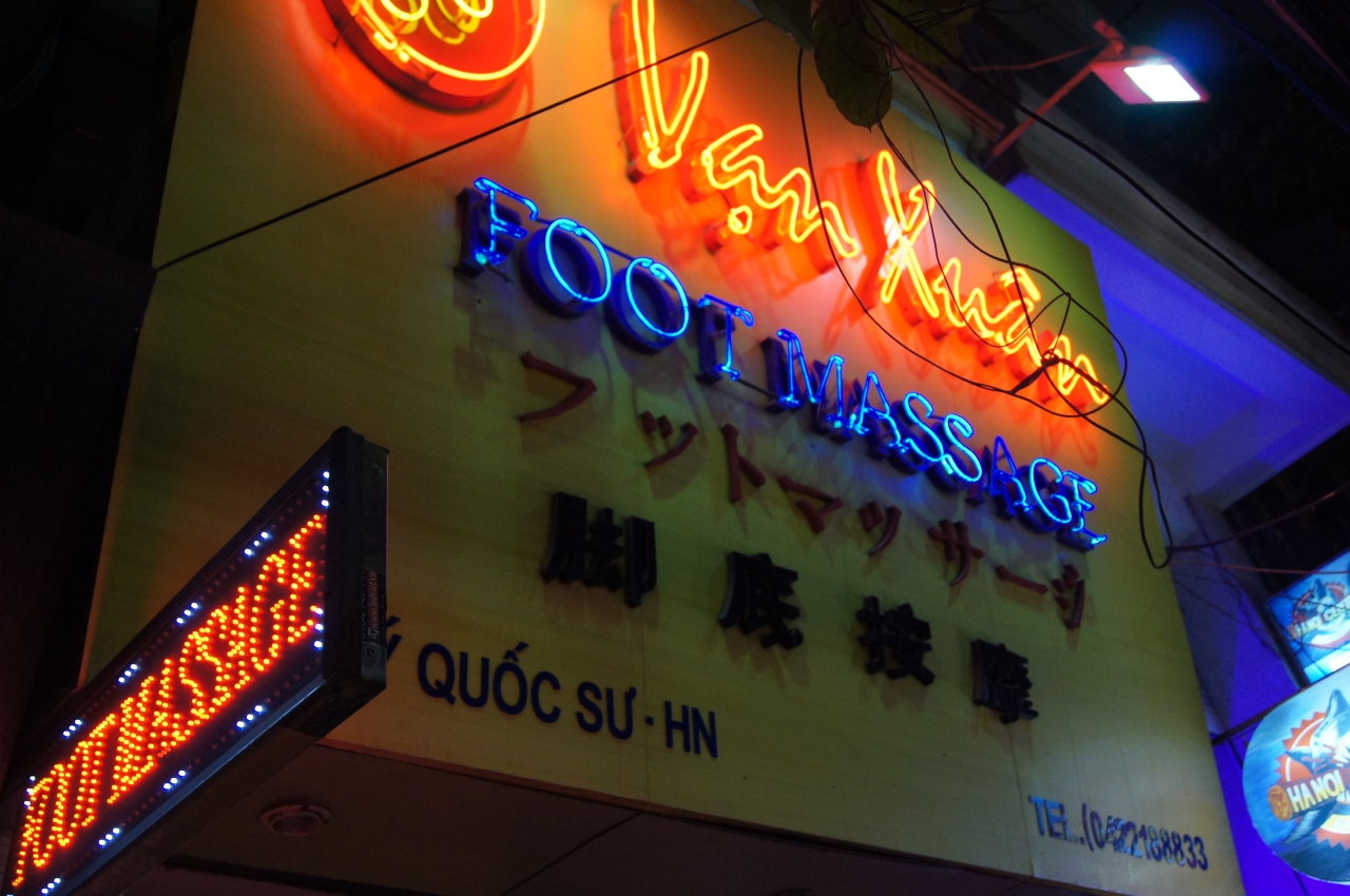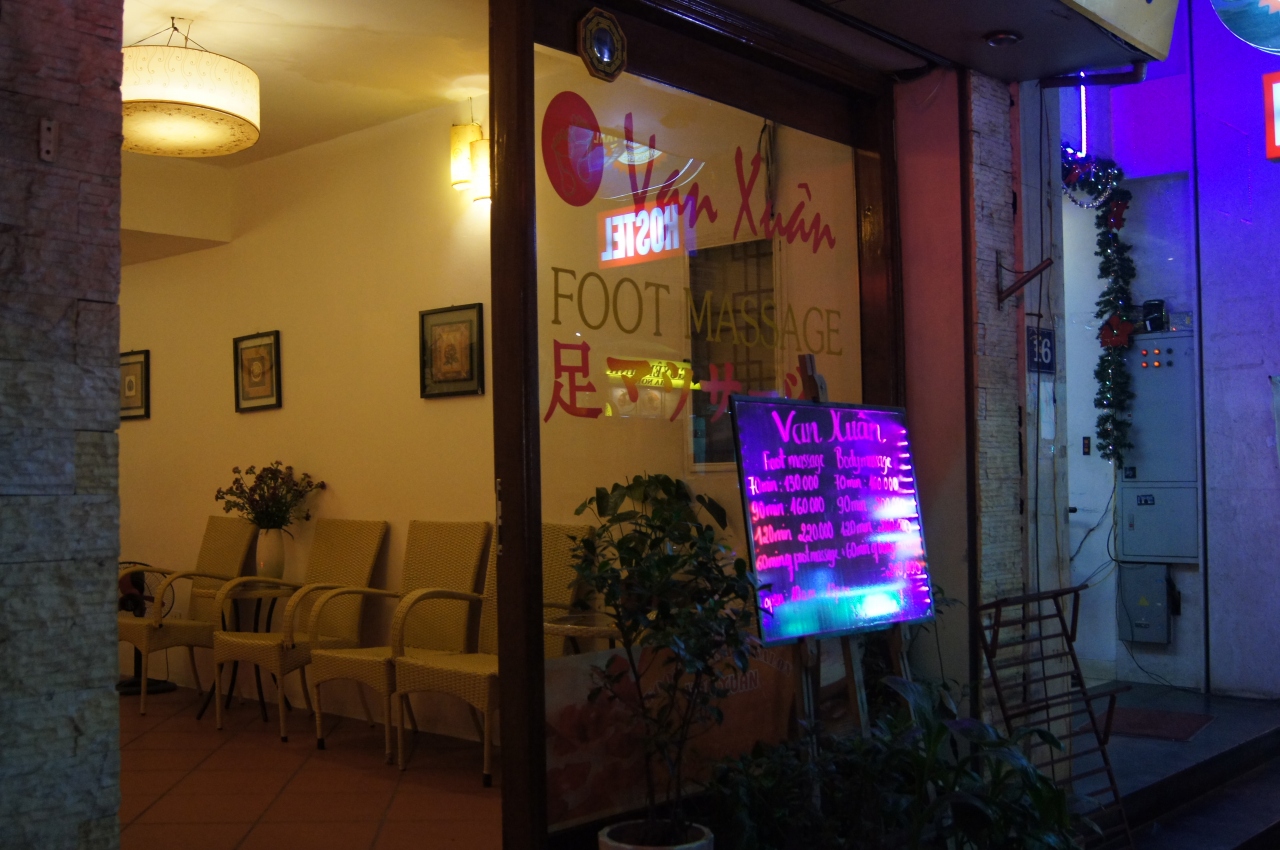 TNKトラベルのハノイ一日コースにセットでした。場所は地図のマーク位置が間違ってます。道の反対側になります。フットマッサージの場合、この店では、ズボンを脱いで渡されたトランクスのパンツに着替えなくてはいけません。短パンなら、着替えなくても良いと思われます。店舗は縦長で、受付の部屋から、奥の部屋が施術室、その奥に同じような施術室がもう一部屋あり、奥の部屋には客がいませんでしたので、妻はそちらで着替えました。足は膝の上あたりから下をマッサージします。スタッフは若いにいちゃんやねえちゃんでそんなにうまいとはおもえませんが、気持ちよいです。ツアーなので料金は払いませんでしたが表にフットマッサージ70分13万ドン(600円程度)と書かれていました。安いですね。気持ちよかったので、チップに6万ドン/1人。(相場は4万ドン)