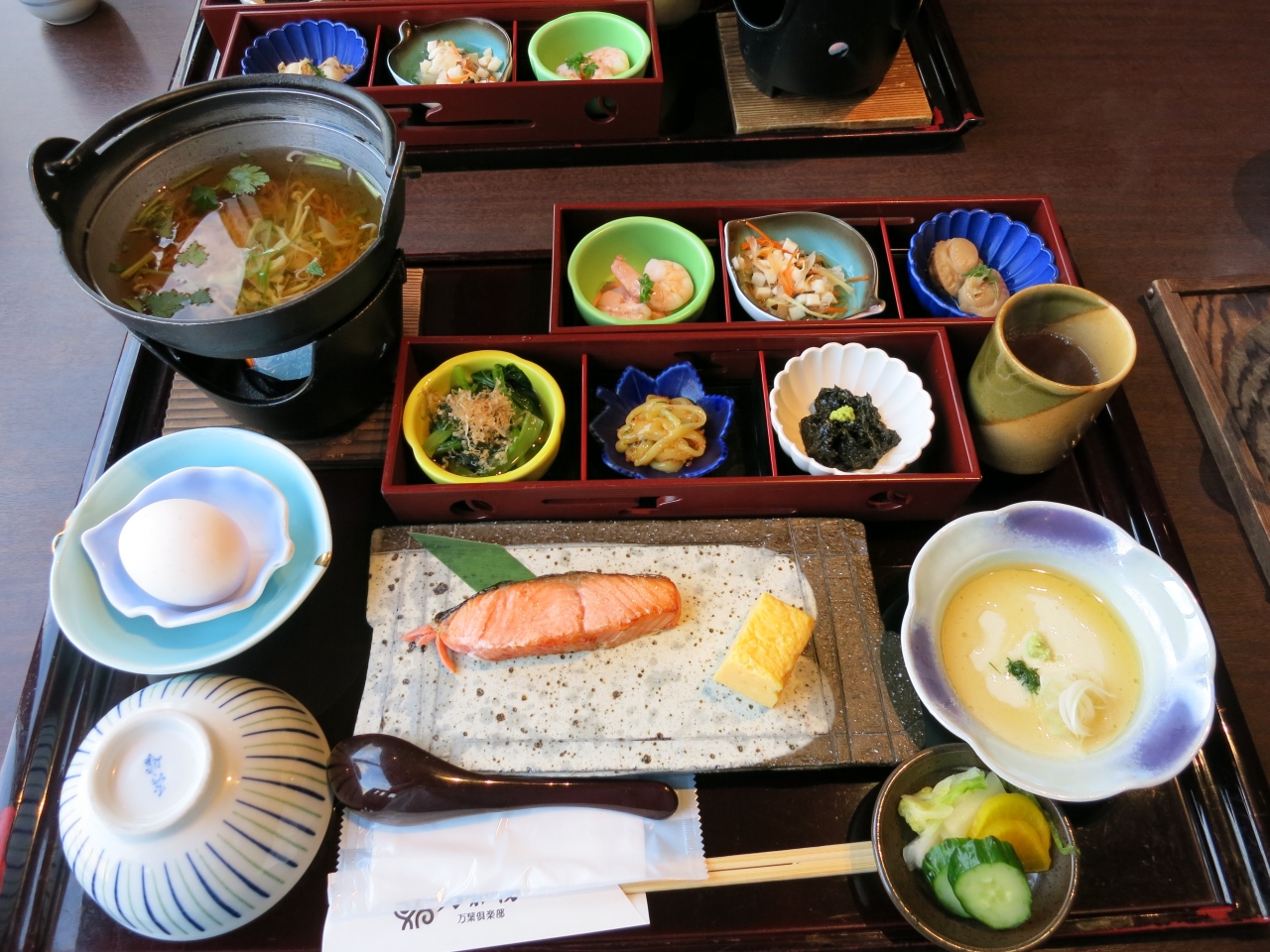 朝食付きで、宿泊しました。部屋は狭間6畳程度。布団2組でいっぱいです。ですから、テーブルは押入れの下にスライドして格納するようになってました。布団は自分で敷きます。お湯は塩素の匂いが強いです。たくさんの人が入る循環湯でしょうから、消毒は止むを得ないですね。大分に住んでいる私にとっては、あまり入りたいお湯ではありませんでした。朝食はついてました。これは、朝からおなか一杯。おいしかったです。