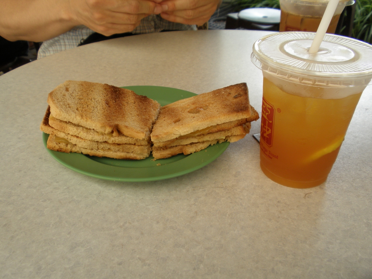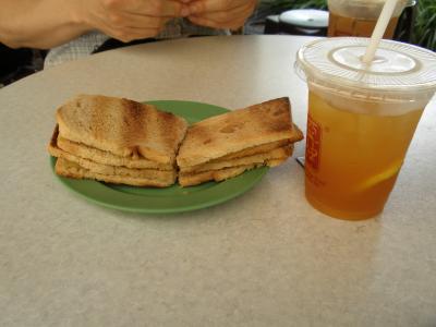 名物は、そこで食べてこそ名物。で、本店まで行ってきました。狭い店ですが、店の外にはテーブルがあって外でも食べられます。卵をつけるのが定番とのことですが、おなかはいっぱいだったのでトーストだけにしました。注文してお金を払ったら、テーブルまで持ってきてくれました。チップがいらないので楽ですね。この独特の甘さはくせになります。