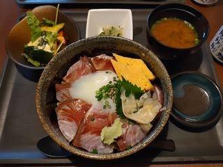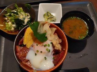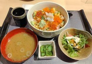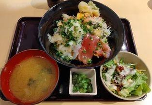 お昼時、近隣の会社員で混雑していました。女性客よりも男性客の方が多い感じです。小食の方用のご飯少なめもあります。海鮮丼にサラダ、小鉢、味噌汁が付きます。ただ、味噌汁がゴクゴク飲めるヌルさだったのが残念でした。