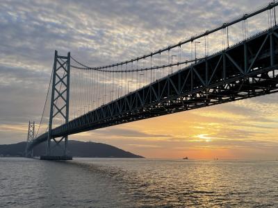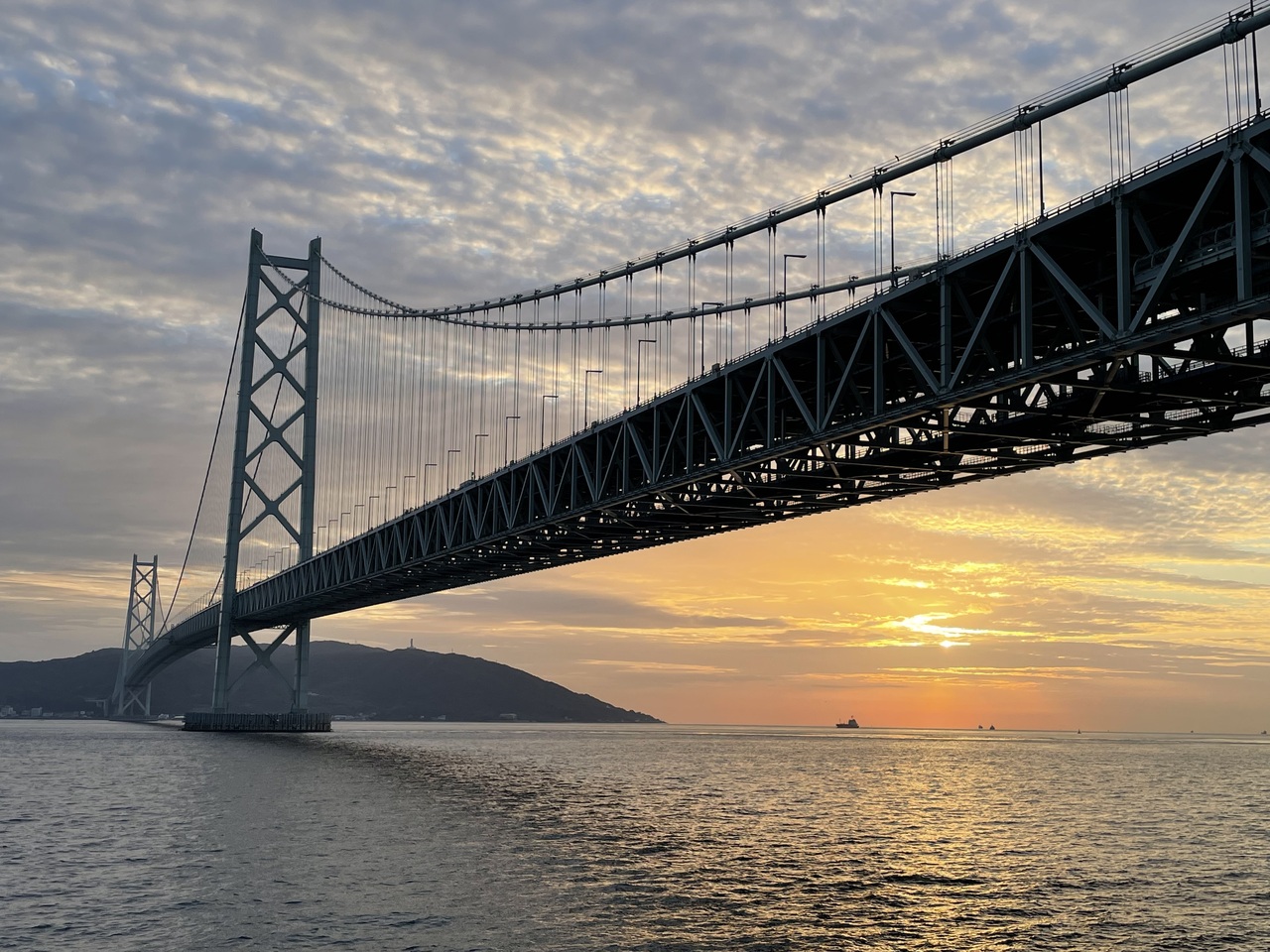 明石海峡を横断して、本州側の舞子と淡路島の岩屋を結ぶ巨大な吊橋です。全長は3911メートルあります。主塔は300メートル近くあり、東京タワーにも匹敵することが驚きです。淡路島側に沈む夕日が印象的でした。
