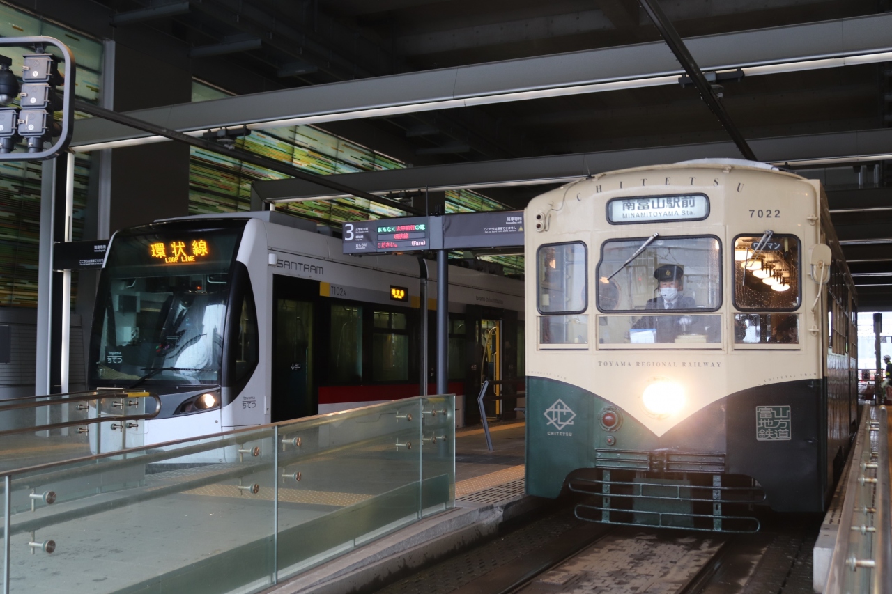 富山地方鉄道の市内線です。北陸線の南側、富山の中心部に路線網をもっています。この春、北側の富山ライトレールと合併し、岩瀬浜から全線が富山地鉄の管轄になり、待望の直通運転が開始されました。新幹線をくぐる形で富山駅を縦断します。