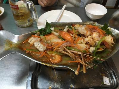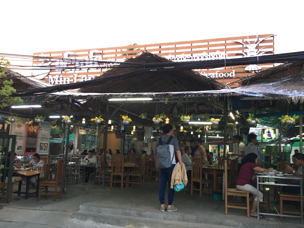 ヤンゴンの海鮮レストラン。いけす水槽が多く並んでおり、えびやいかなどいろいろな海鮮料理が楽しめます。地元の人が多く、大人数で賑わっています。ヤンゴンの町の中心部からちょっと離れており、車で行きました。