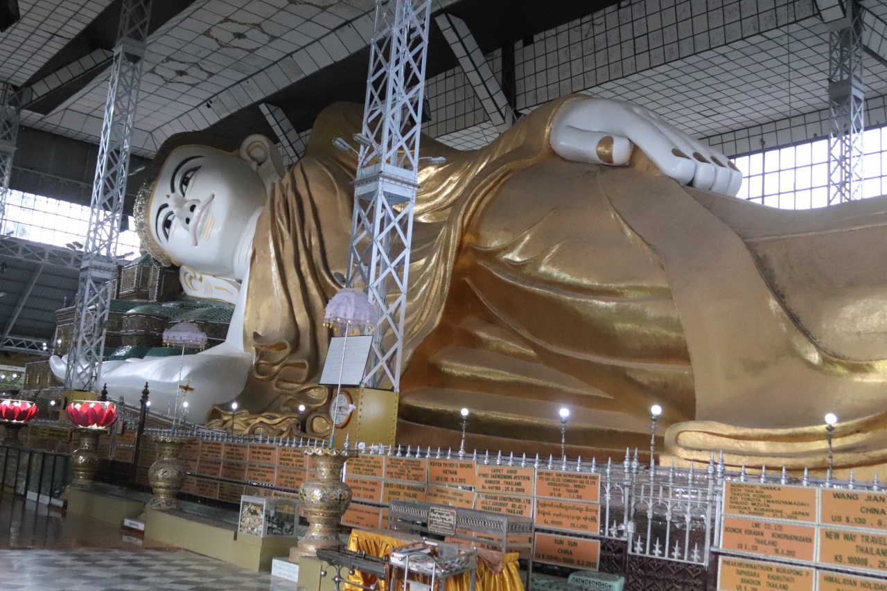 バゴーの中心部にあるミャンマー最古の寝仏です。入場料はバゴーの観光地の共通券になっています。巨大な寝仏には屋根がかかっているので、見学の間、暑さはいくぶんかしのげます。全長は54.88メートルもあります。