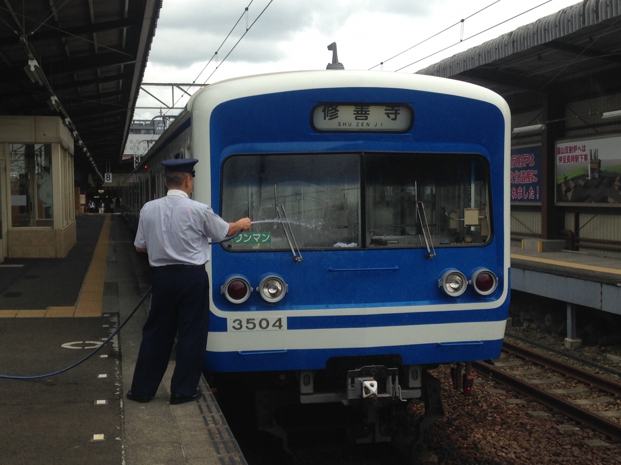 三島と修善寺を結ぶ私鉄線です。東京から特急「踊り子」も乗り入れ、週末は観光路線となりますが、平日はのどかなローカル鉄道です。商用で利用しましたが、ボックス席の車両も多く、ちょっとした旅気分を楽しめます。昼下がり、三島駅では運転士さんが電車の運転席の窓ガラスを洗っていました。