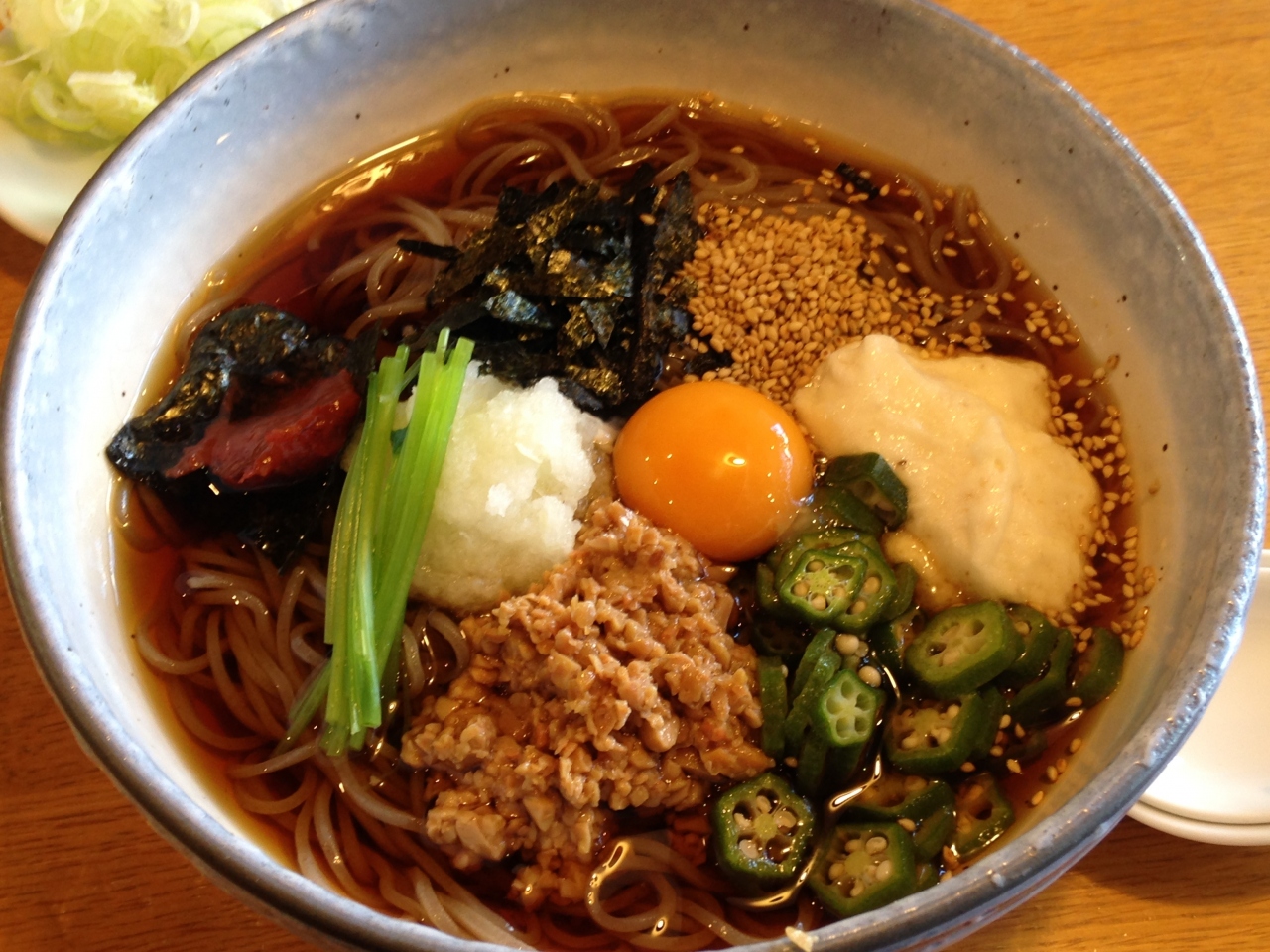 静岡の蕎麦チェーンの静岡インター店です。外観も店内も和風で落ち着いた感じです。冷たいねばとろそばをいただきました。そばは透き通っており、冷麺のようでした。おくら、納豆、山芋、生たまごがのり、ネバネバのオールスターでした。