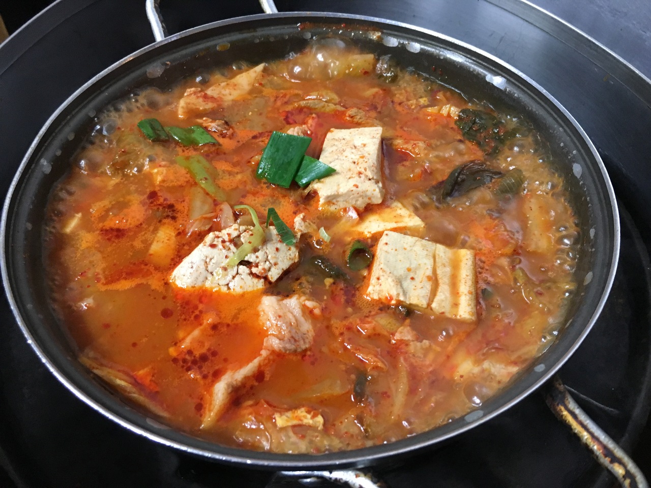 光化門にあるキムチチゲの大衆食堂です。地元の人がひっきりなしに入ってきます。チゲは1人用からあり、テーブルにつくと、すぐに人数分の大きさの鍋がセットされます。ケランマリ(たまごやき)と一緒にいただいて満腹です。