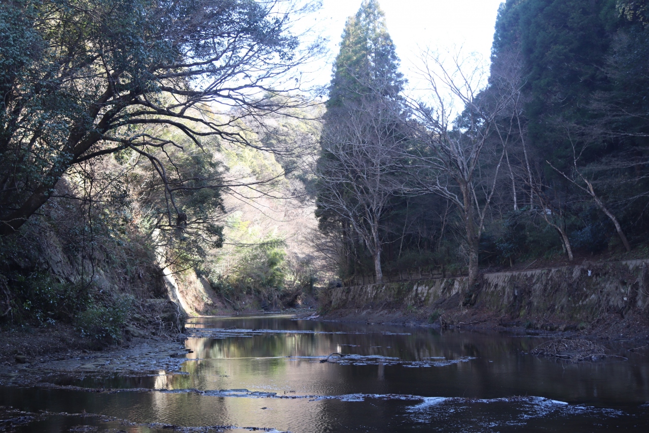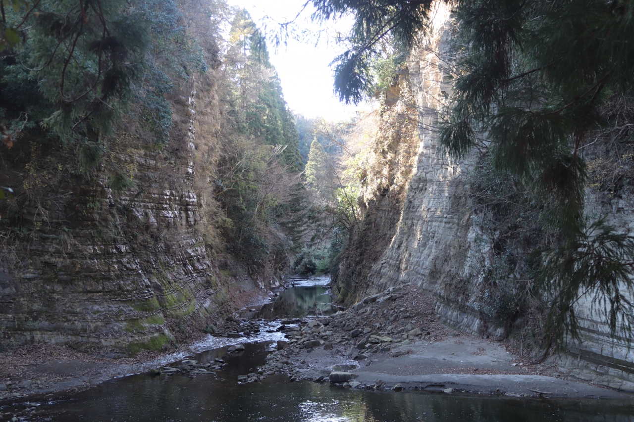 養老渓谷の旅館街、赤い太鼓橋の観音橋を渡ると、山の中に、急坂や急な階段が続きます。もう勘弁というところでトンネルを抜けると山の中に境内がひろがりました。源頼朝伝説が残り、出世観音として知られています。