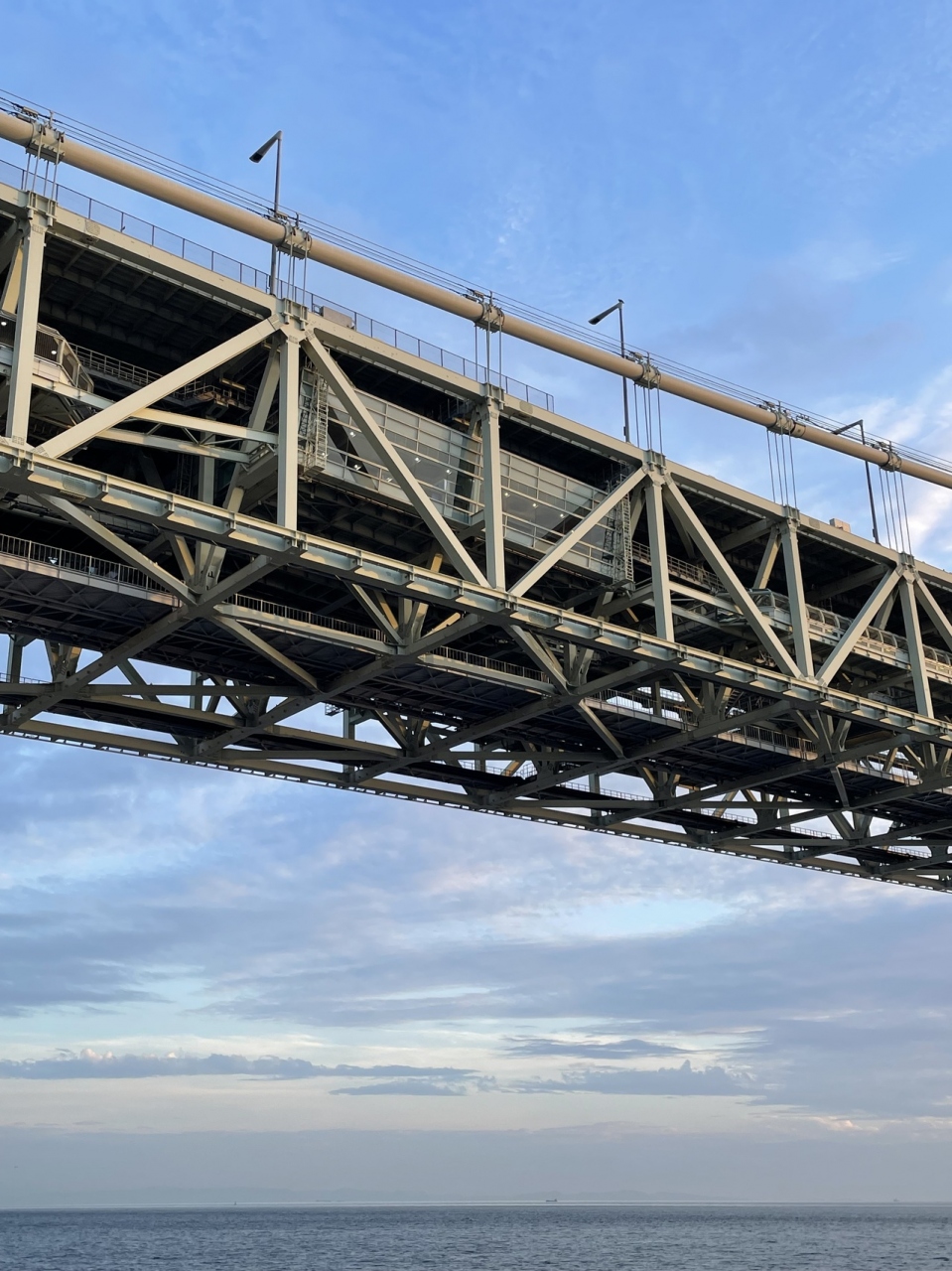 明石海峡大橋の舞子側、橋に併設された海上の展望台です。通常は自動車でしか通ることができない橋の上からゆっくり眺望を楽しむことができます。舞子側は突き出している回遊式の展望台になっています。一部丸木橋になっています。