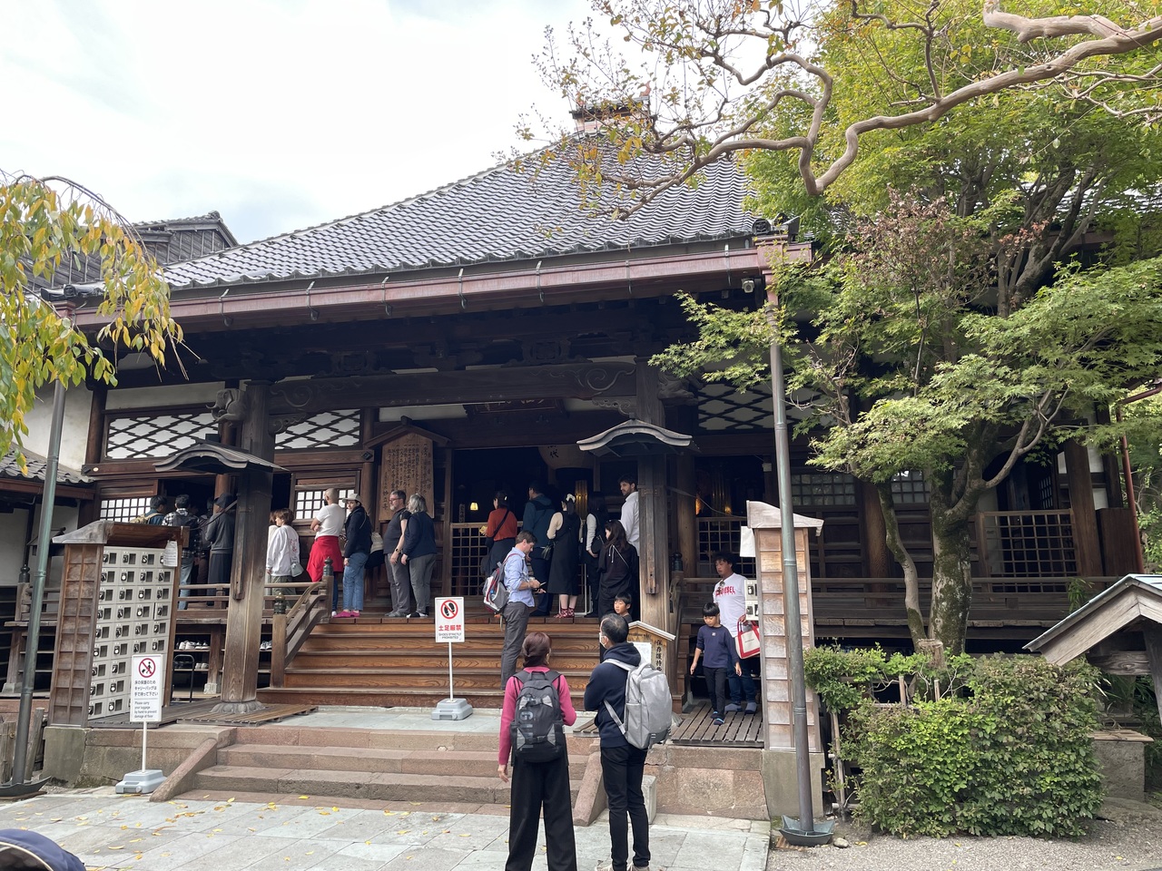 にし茶屋街から道路をはさんですぐ、寺町を散策しました。人気は忍者寺で有名な日蓮宗妙立寺です。受付にはたくさんの列ができていましたが、なんと堂内の見学は事前予約制のようです。にし茶屋街から入る場合は裏門から入ります。