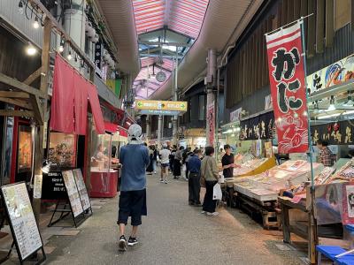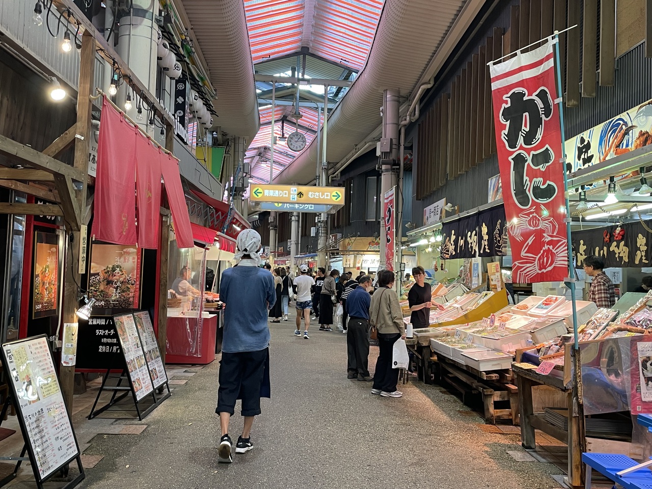 金沢の台所というより、観光市場街です。最寄りバス停は武蔵ヶ辻、道路沿いの近江町いちば館をメインにその後方にもたくさんの商店や食堂が集まっています。観光客でごったがえしていましたが、買い物というより、食事で集まってました。